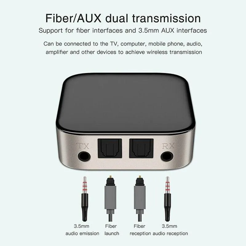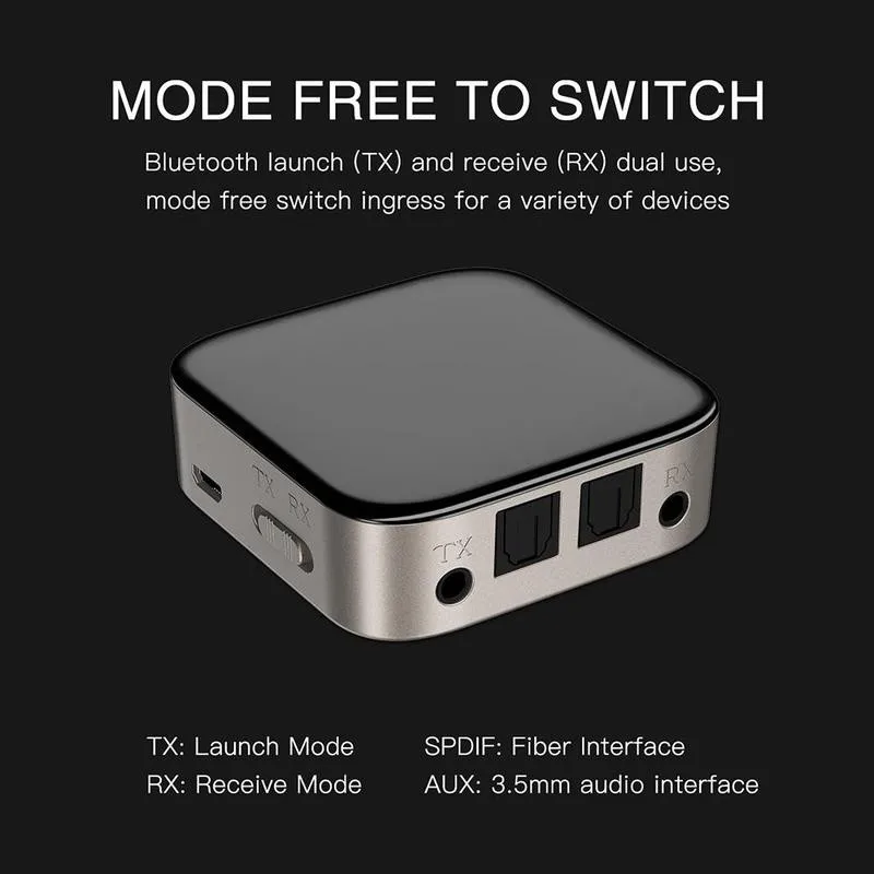 The new 5.0 transmitter is a two-in-one stereo Bluetooth adapter with optical fiber. You can switch between receiving state (RX) or transmitting state (TX) by
