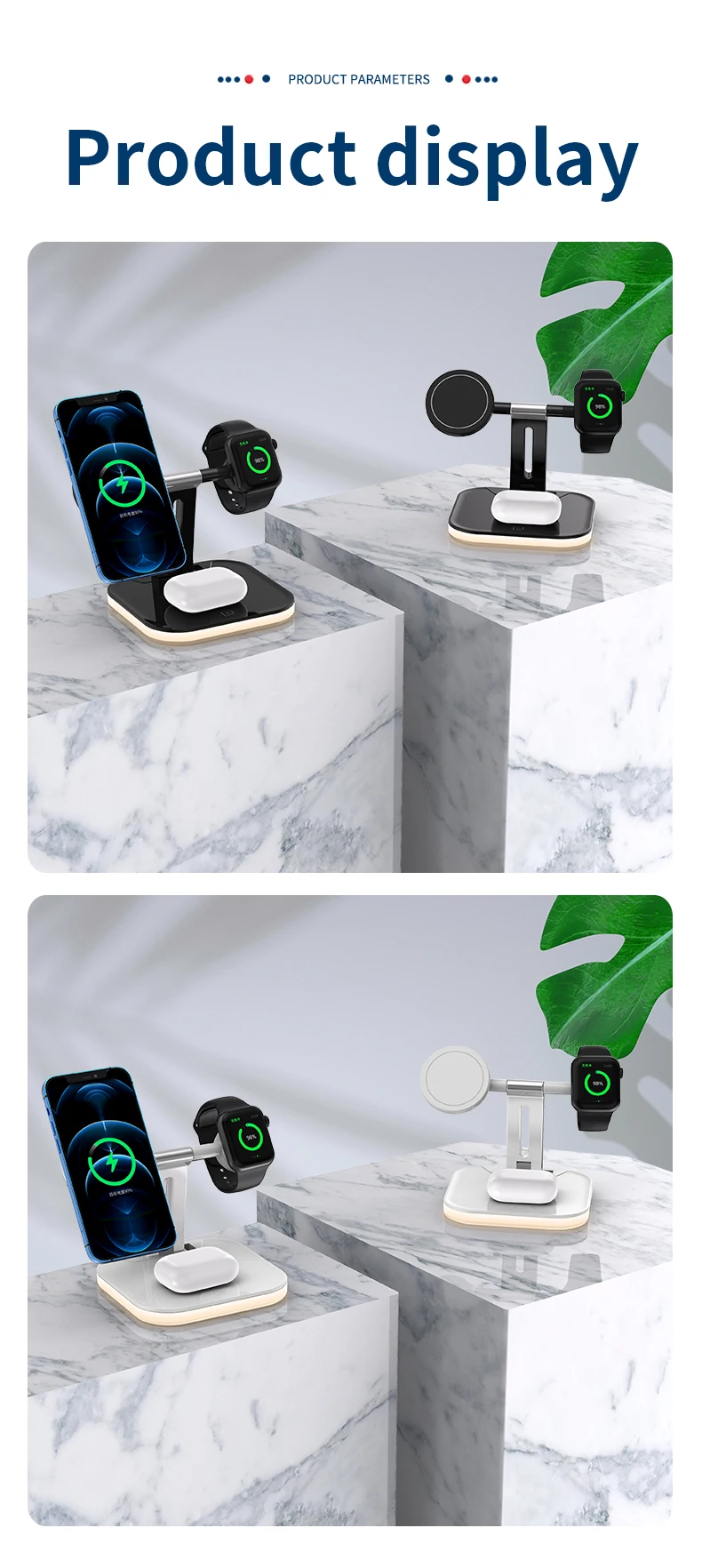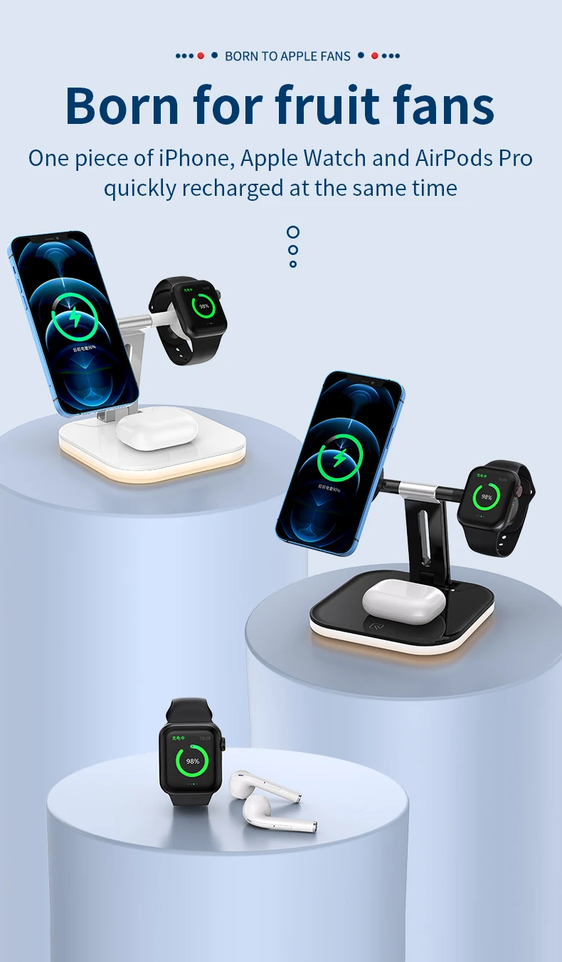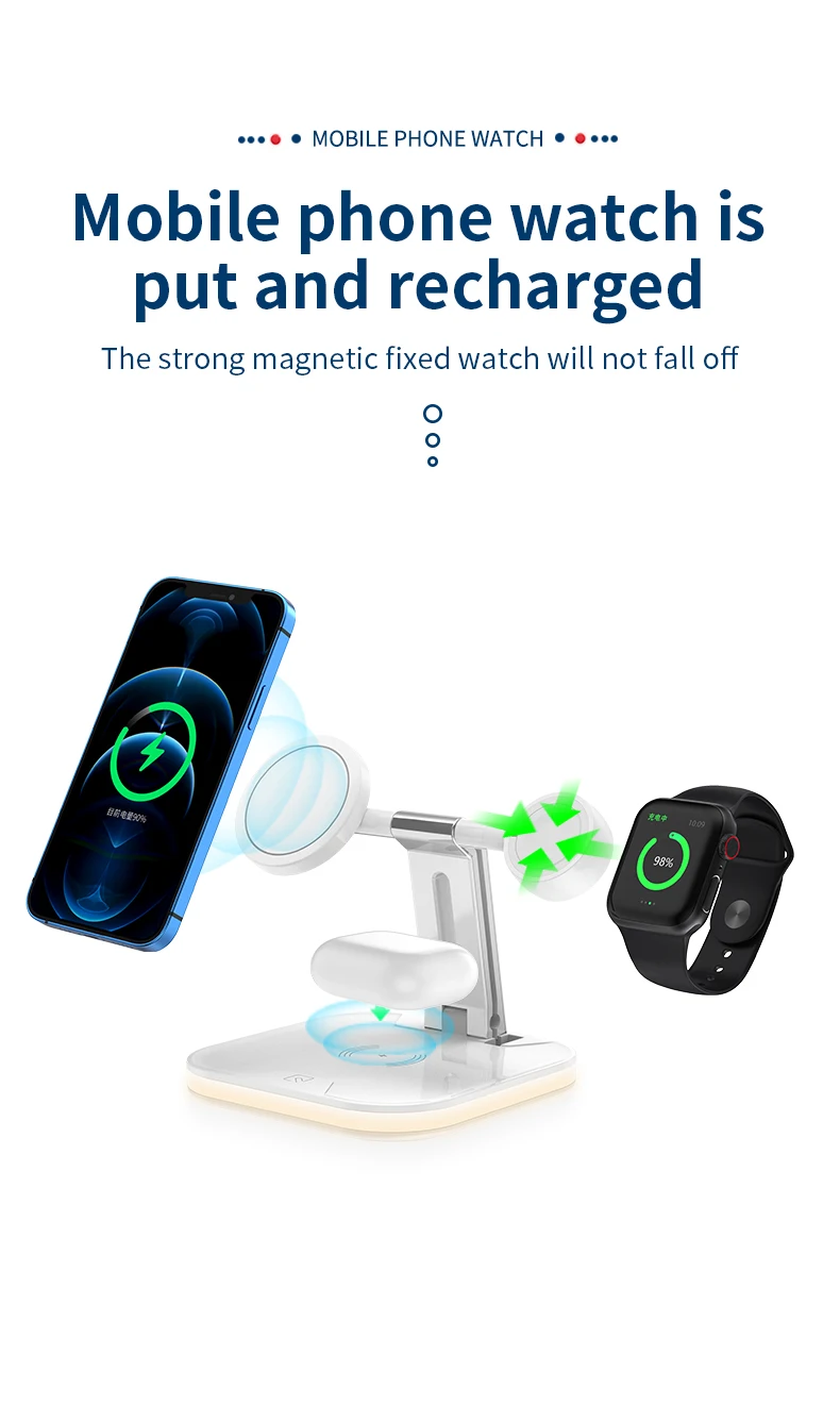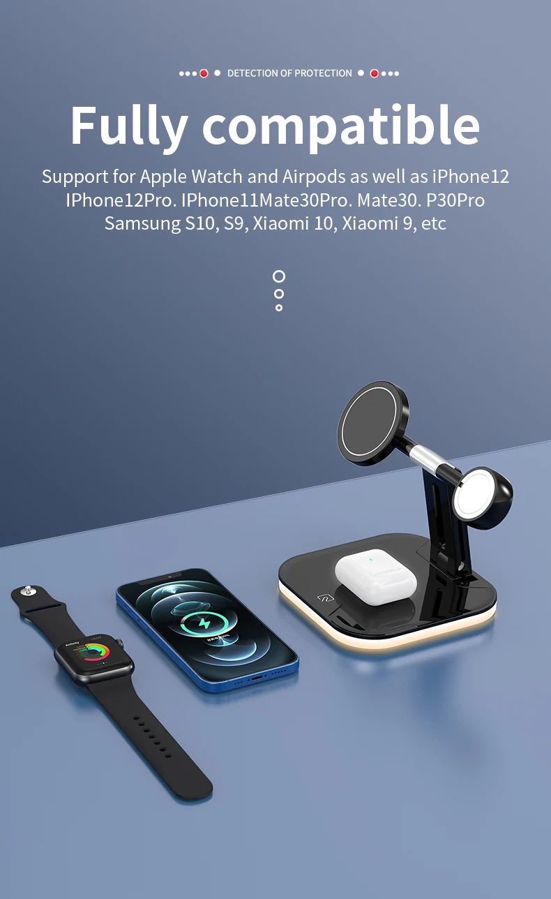 QC3.0 Adapter, 1 x Manual. We take responsibility for our products. Click on the “Add to cart” button now and get this cool accessories for your iphone products. 【15W Fast Wireless Charging Station】The wireless charger car mount designed with Overcurrent/Overheat/Over-Voltage Protection, Short Circuit Safeguards. It can intelligently identify wireless fast charging device and smartly adjust power among 5W, 7.5W, 10W, 15W. 【Be your Night light】There is a light under the charging base, and the light will automatically turn on when charging (it can also turn on without charging). Of course, you can turn off or self-adjust it if you don't need it. There are two gears to choose from.This feature can help you see more clearly at night or act as your bedside lamp. 【Strong Magnet】Custom designed for iPhone 12/12 Mini/ 12 Pro/12 Pro Max. Built-in strong magnets and anti-slip silicone produce stable hold for mobile phone. It supports mobile phone vertical or horizontal charging for better viewing of video. At the same time, the closed magnetic field would not affect the phone signal. NOTE:Qi-Enabled Phones can use the magnet case, but the charging effect is not guaranteed. 【3-in-1, Save Space】Adopting the wireless technology, this wireless charging station supports to charging your IPhone 12/12 Mini/12 Pro/12 Pro Max, iWatch Series 6/5/4/3/2/1, AirPods Pro/2 simultaneously. Hide the redundant cables, and make your desk or nightstand neatly and orginazed. NOTE: NOT support other smart watch.
