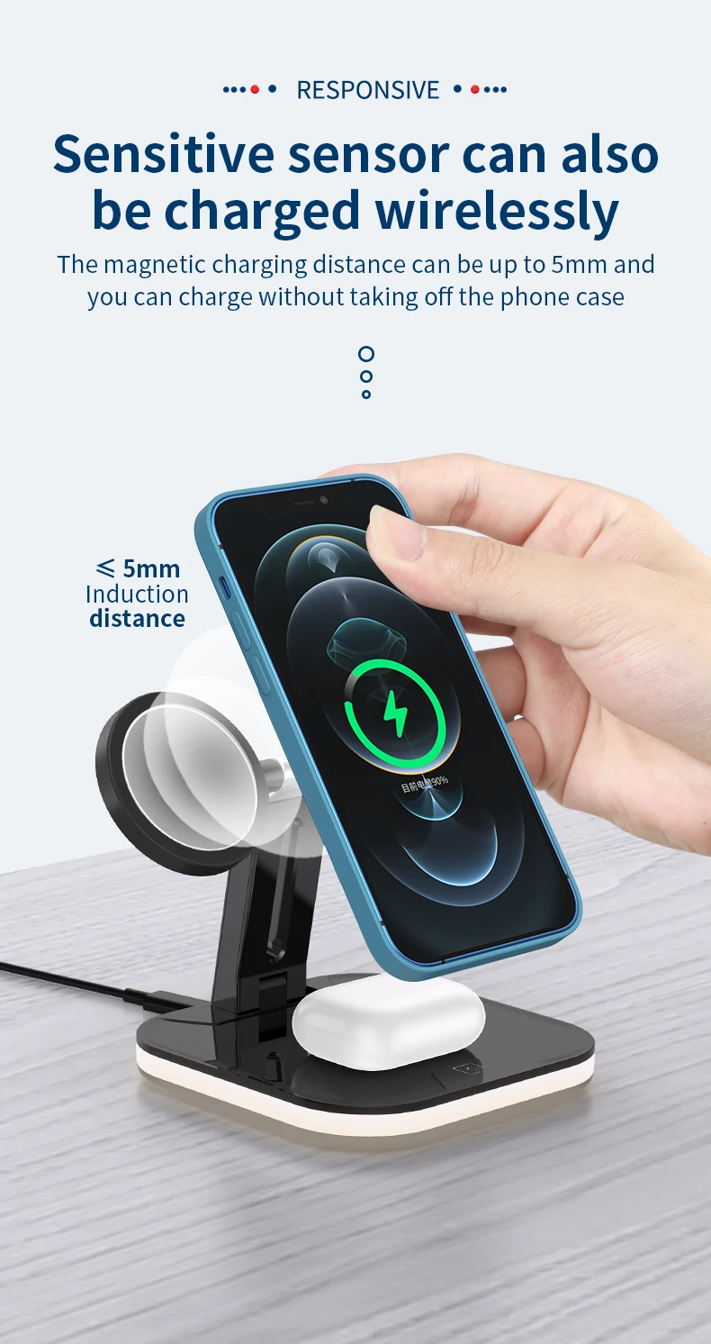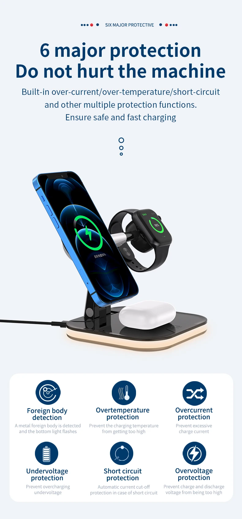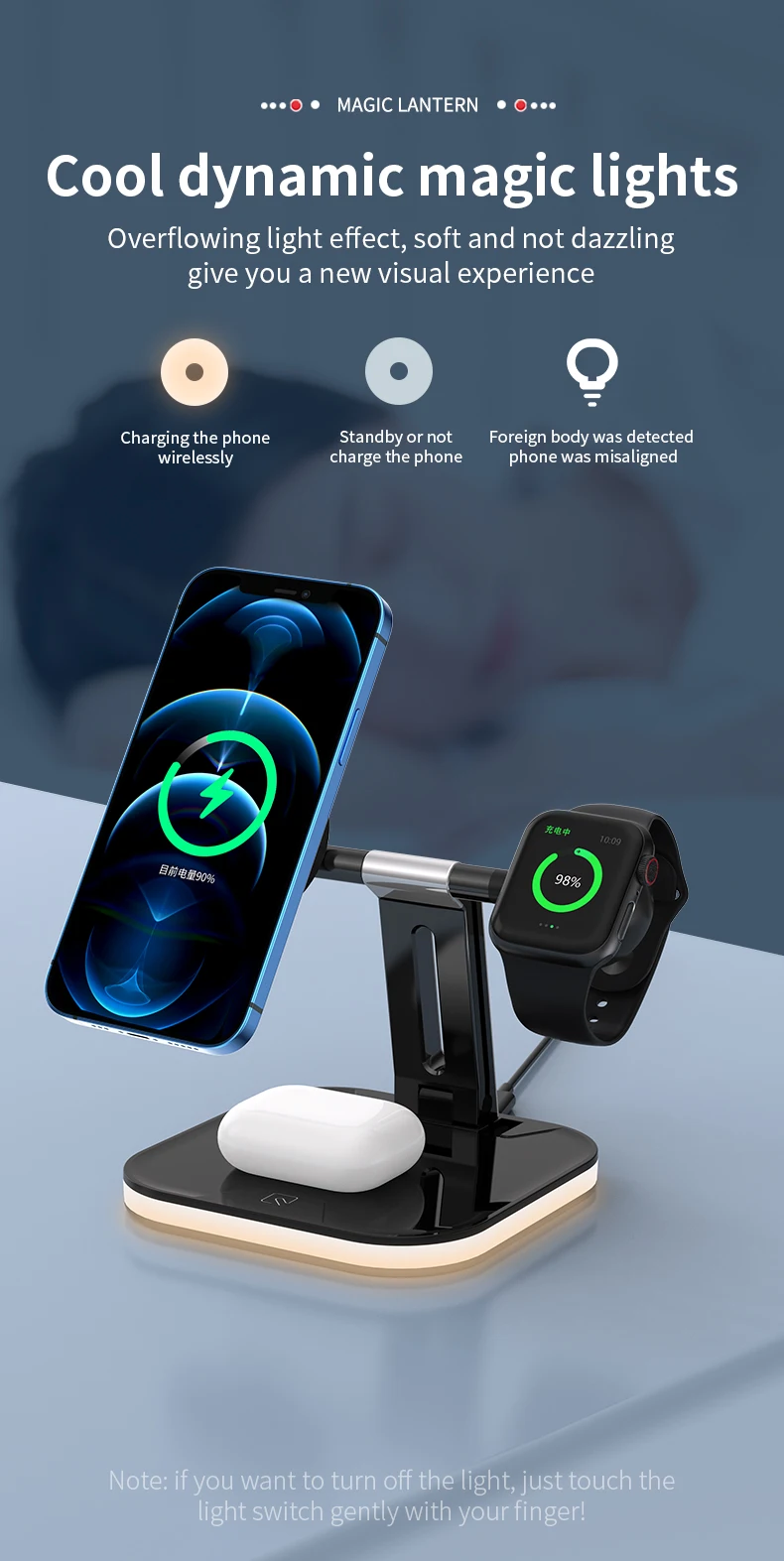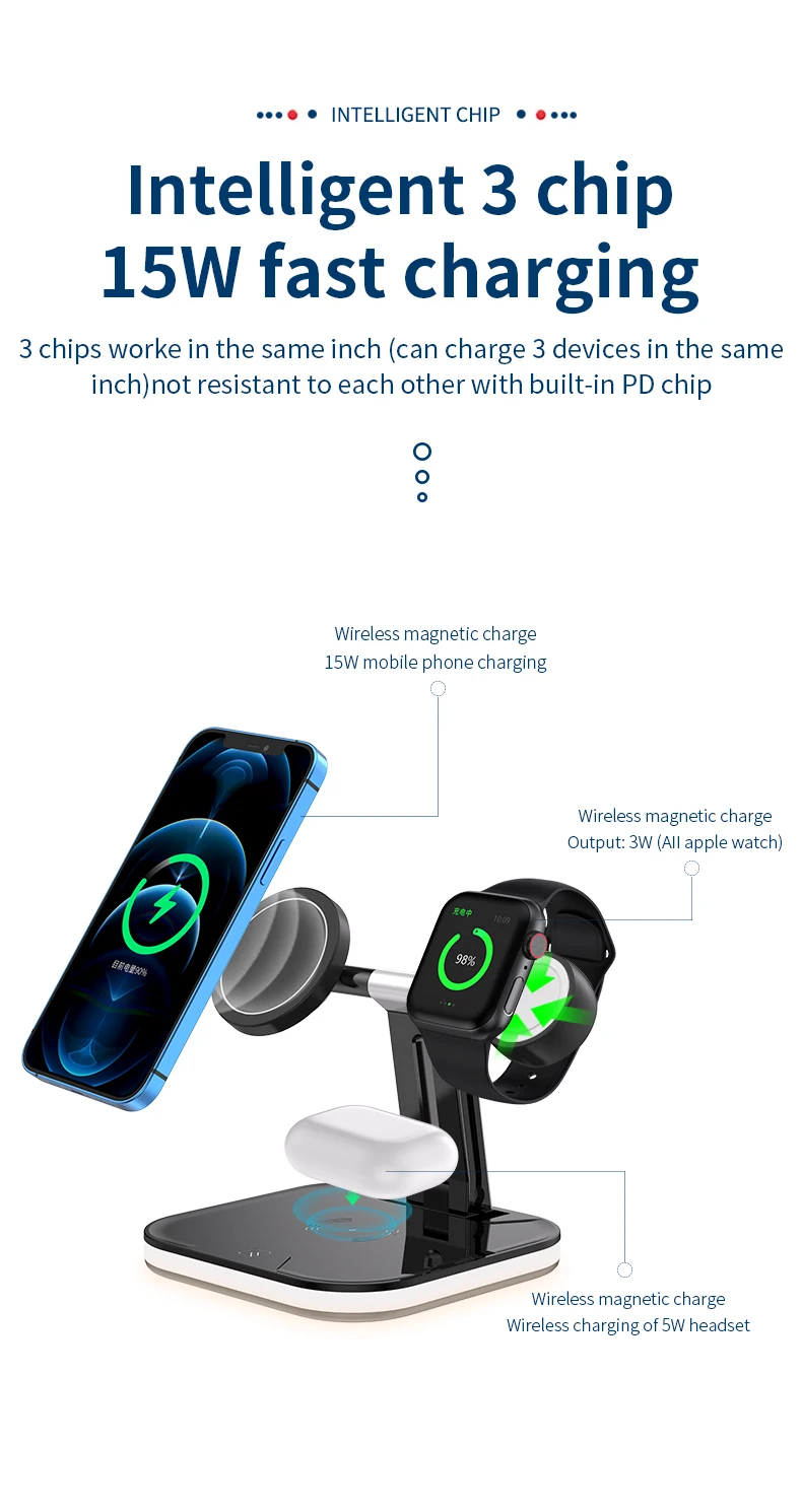 QC3.0 Adapter, 1 x Manual. We take responsibility for our products. Click on the “Add to cart” button now and get this cool accessories for your iphone products. 【15W Fast Wireless Charging Station】The wireless charger car mount designed with Overcurrent/Overheat/Over-Voltage Protection, Short Circuit Safeguards. It can intelligently identify wireless fast charging device and smartly adjust power among 5W, 7.5W, 10W, 15W. 【Be your Night light】There is a light under the charging base, and the light will automatically turn on when charging (it can also turn on without charging). Of course, you can turn off or self-adjust it if you don't need it. There are two gears to choose from.This feature can help you see more clearly at night or act as your bedside lamp. 【Strong Magnet】Custom designed for iPhone 12/12 Mini/ 12 Pro/12 Pro Max. Built-in strong magnets and anti-slip silicone produce stable hold for mobile phone. It supports mobile phone vertical or horizontal charging for better viewing of video. At the same time, the closed magnetic field would not affect the phone signal. NOTE:Qi-Enabled Phones can use the magnet case, but the charging effect is not guaranteed. 【3-in-1, Save Space】Adopting the wireless technology, this wireless charging station supports to charging your IPhone 12/12 Mini/12 Pro/12 Pro Max, iWatch Series 6/5/4/3/2/1, AirPods Pro/2 simultaneously. Hide the redundant cables, and make your desk or nightstand neatly and orginazed. NOTE: NOT support other smart watch.