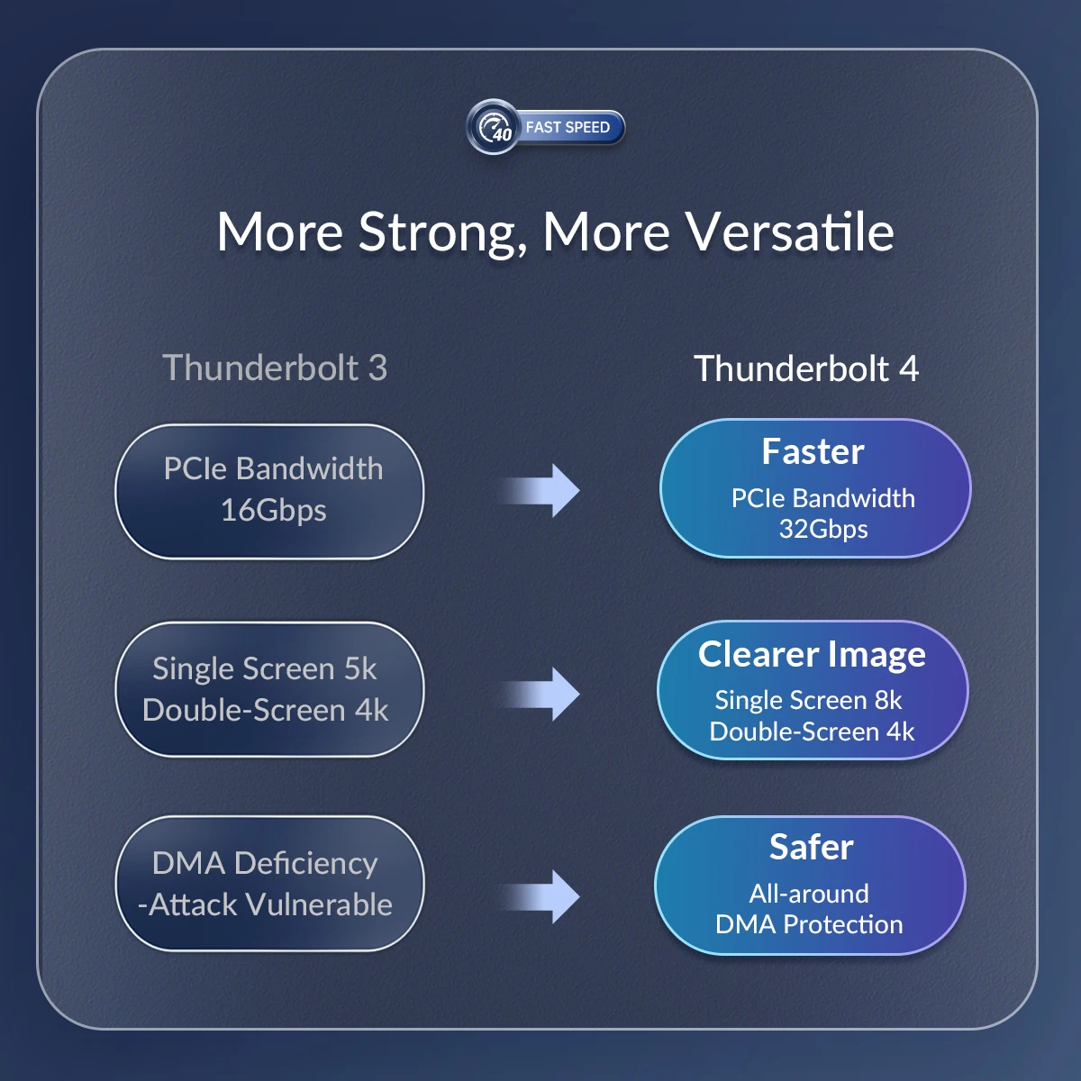 Certified thunderbolt 4 cable support speed up to 40Gbps,In theory, 2.6G data can be transmitted in 1 second. Theoretically, 2.6G data can be transferred in 1 second, which is 2 times faster than Thunderbolt 2, 4 times faster than USB 3.1,and 8 times faster than USB3.0.(The data transfer speed depending on host and device support)