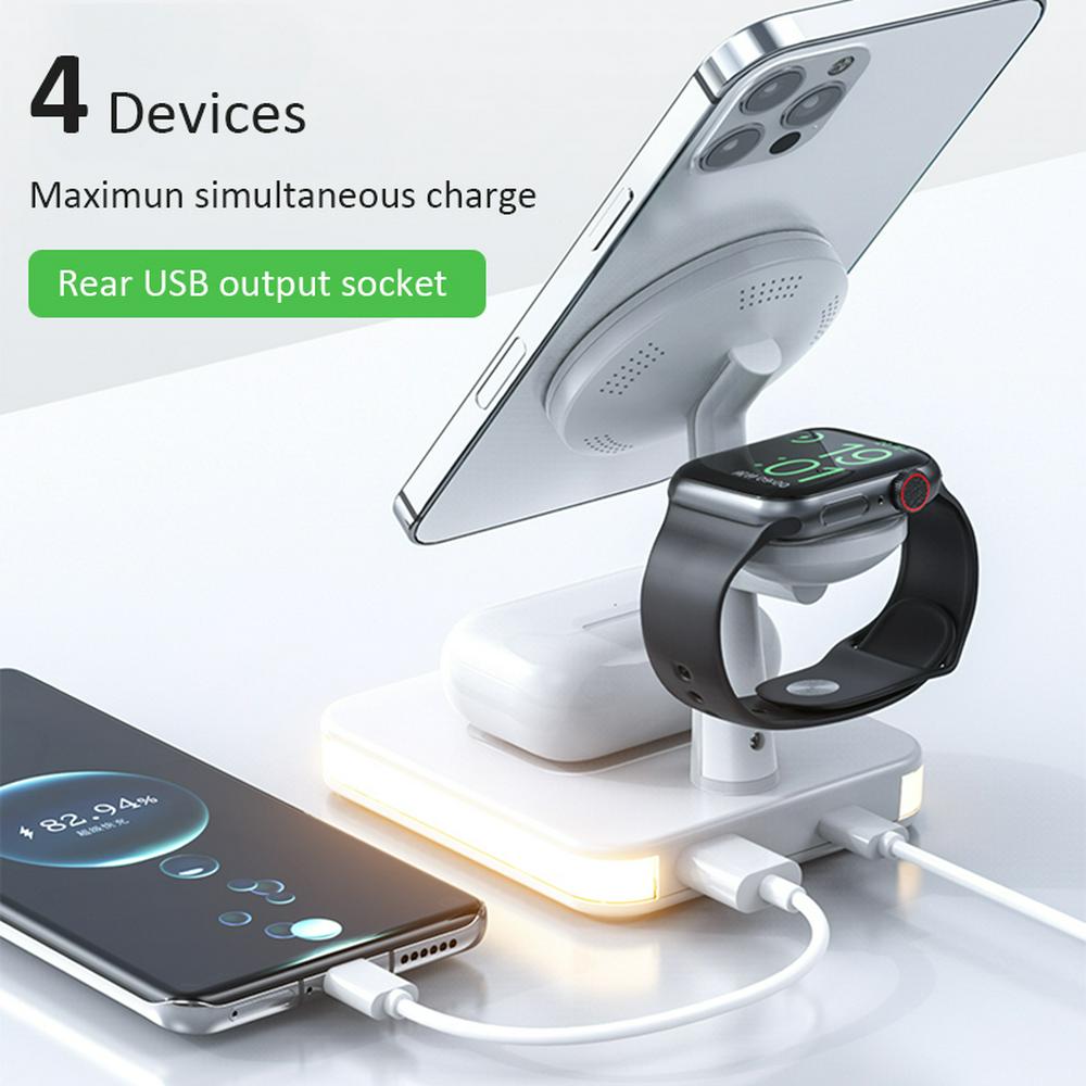 3. Strong magnetic adsorption make the iphone Auto-alignmen and enter the charging state quickly. It supports mobile phones vertical or horizontal charging for better chatting or watching TV. 15W Wireless charger station with QC3.0 adapter and smart design ensures the safety and fast charging of 4 devices at the same time.bringing users faster and more convenient experience. Normally 2~3 hours needed to fully charge 4 devices simultaneously.