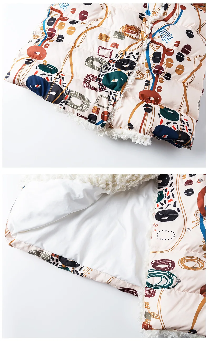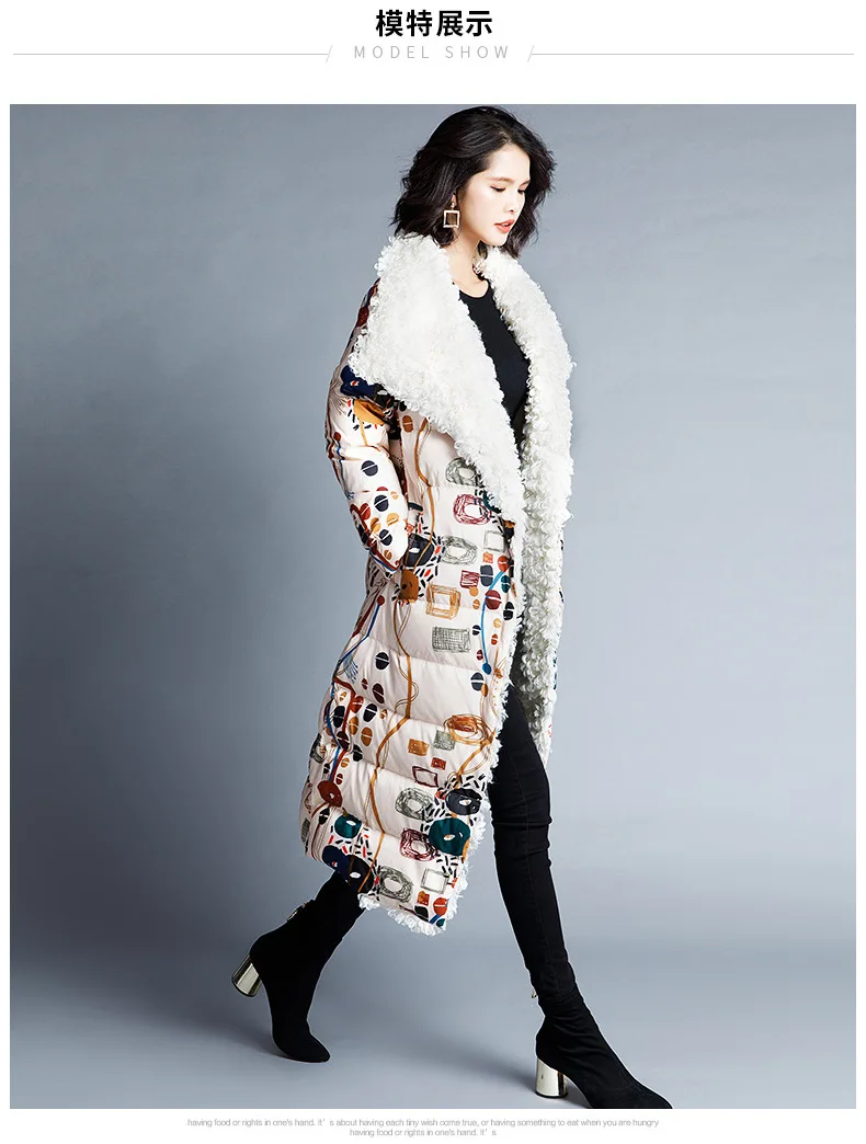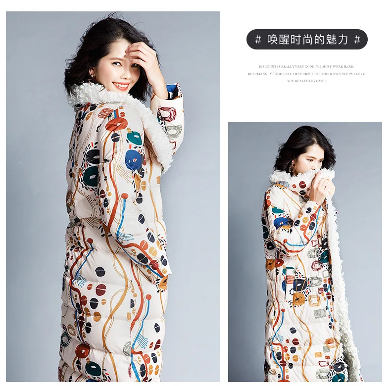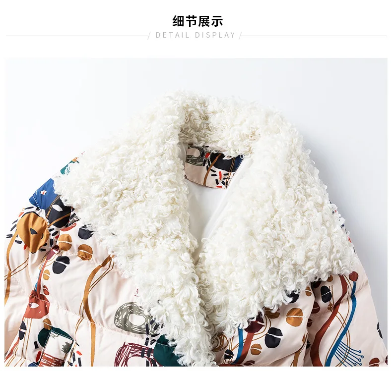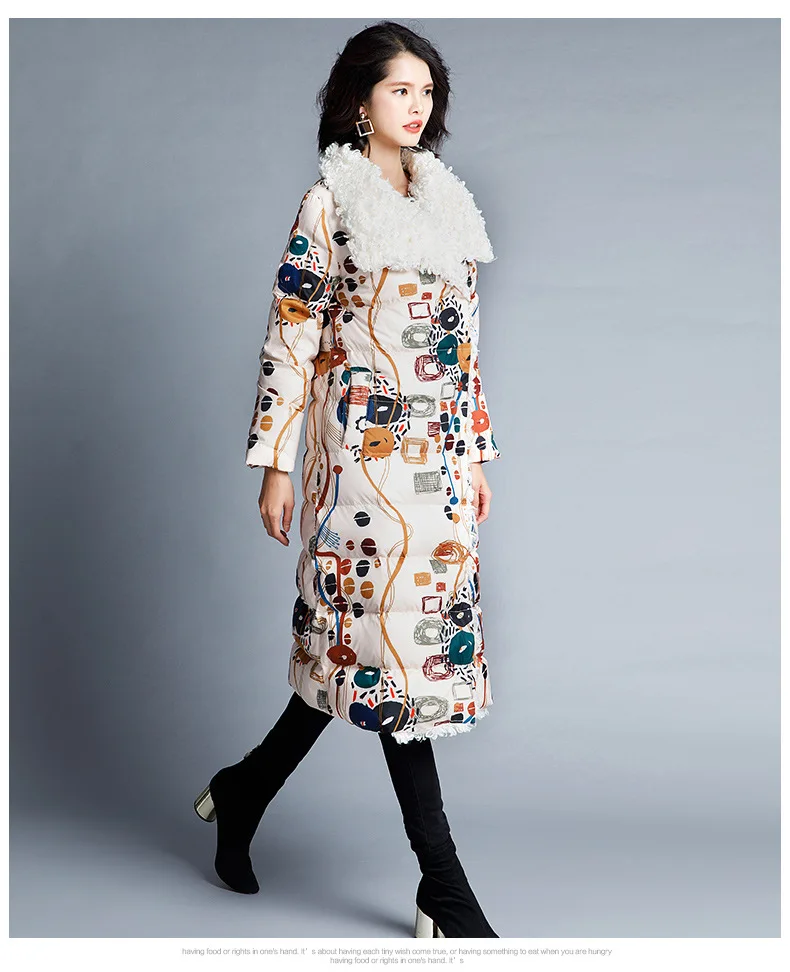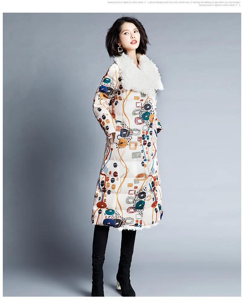 90% White Duck Down Thicken Warm Keeping Jacket Women Colored Printed Wool Roll Down Jacket Female Overcoat