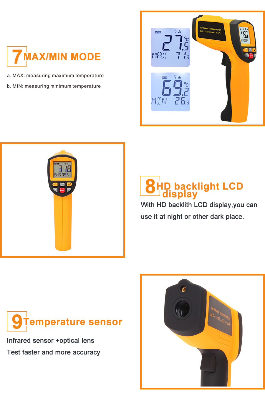 5,Laser on/off switch, Auto power off & temperature data hold.