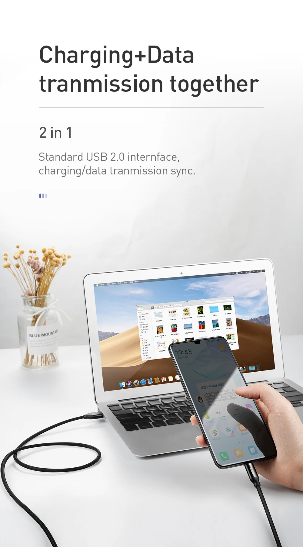 Charging+data transmission together:2 in 1,standard USB 2.0 interface,charging/data transmission sync.