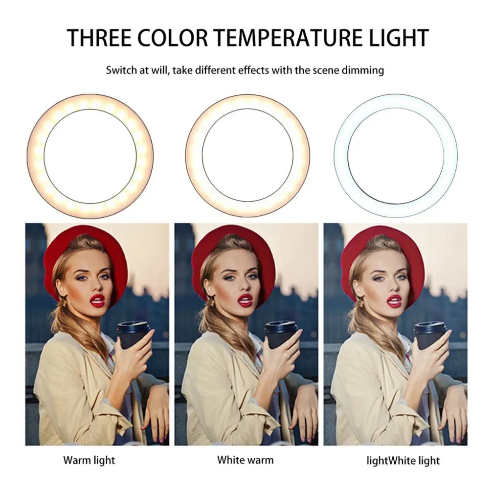 1.10.23inch ring light: LED light design, 11 kinds of adjustable brightness for you to choose, to meet all your needs in different environments. 3 light modes: white, warm yellow, warm yellow + white. It will come in handy whenever you need extra light to take pictures, take pictures, make videos, read books and broadcast live.