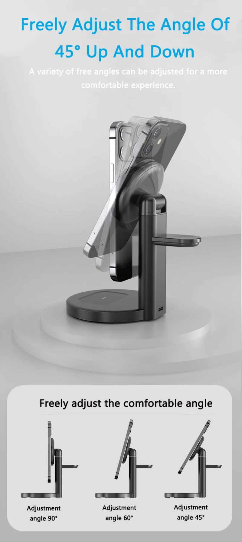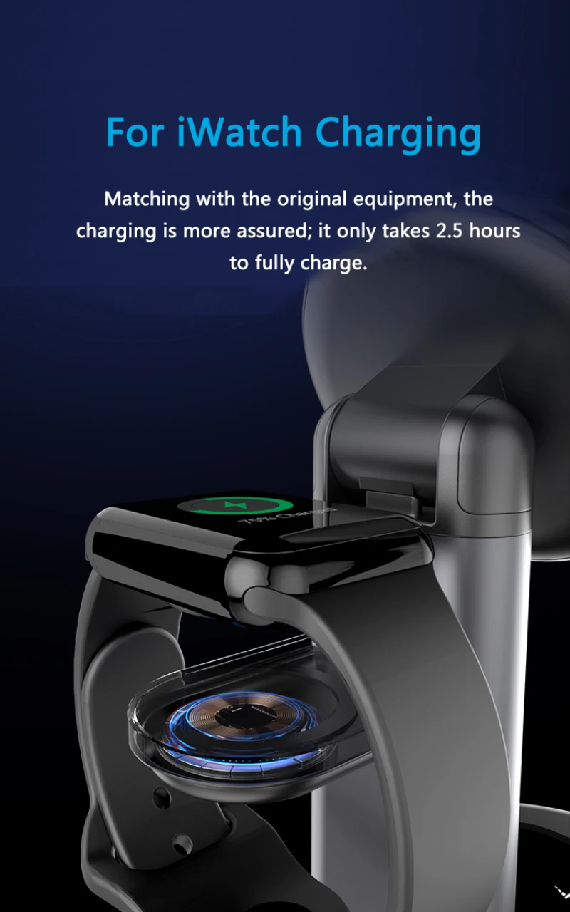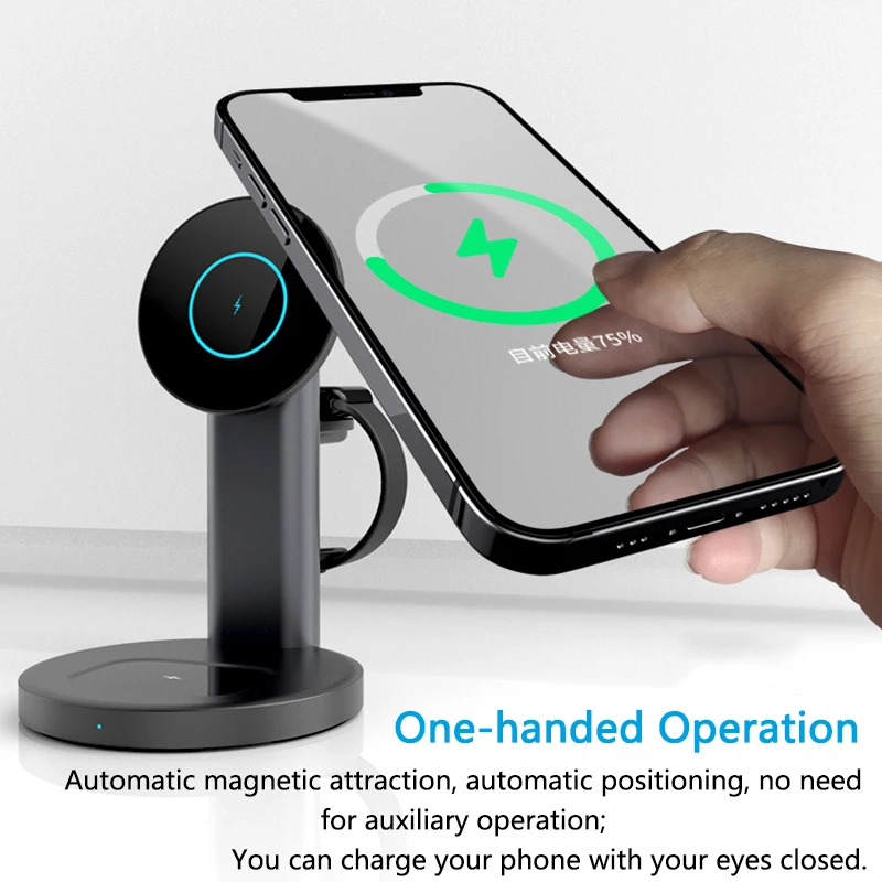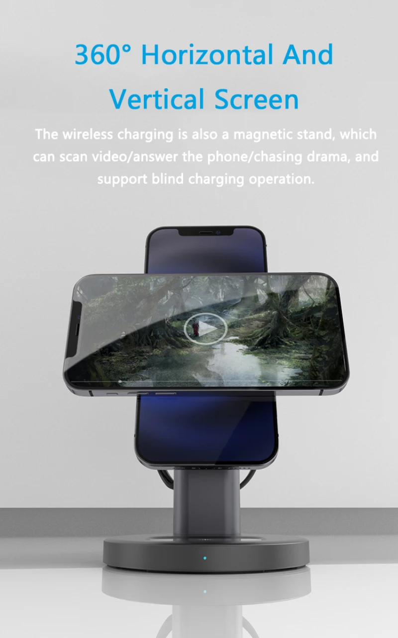 【3 in 1 Wireless charging Station】Built-in powerful magnet,anti-slip silicone at the bottom can provide stable support for the iphone. It supports vertical or horizontal charging of mobile phones, and you can watch videos while charging.
