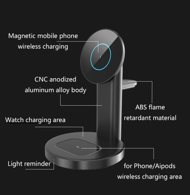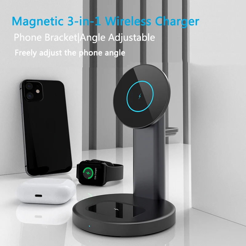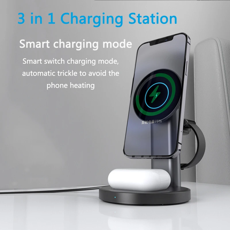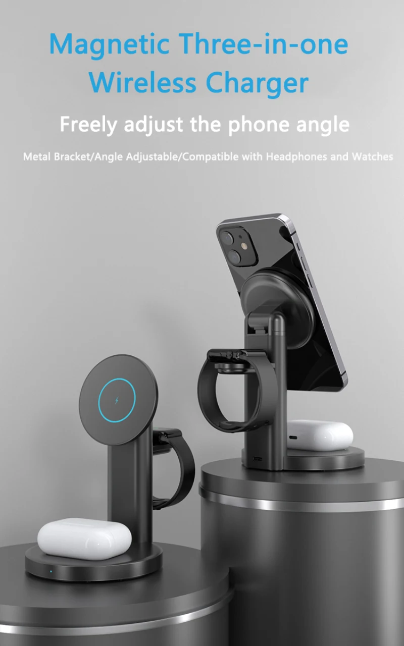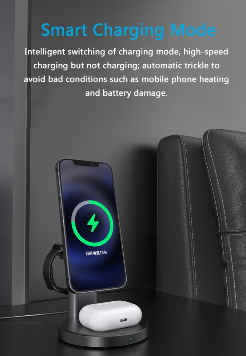 【3 in 1 Wireless charging Station】Built-in powerful magnet,anti-slip silicone at the bottom can provide stable support for the iphone. It supports vertical or horizontal charging of mobile phones, and you can watch videos while charging.