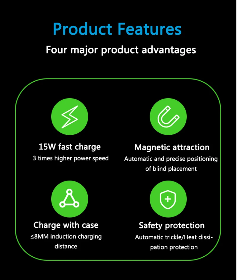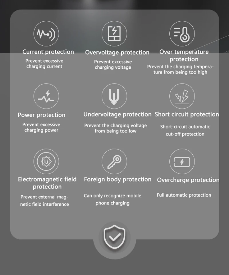 【Smart Charger Protection】This charger dock built-in smart chip, which can provide over-voltage protection, over-current protection, short-circuit prevention, temperature control as well as foreign object detection function. (NOTE: Do not place metal foreign objects on the back the phone case)