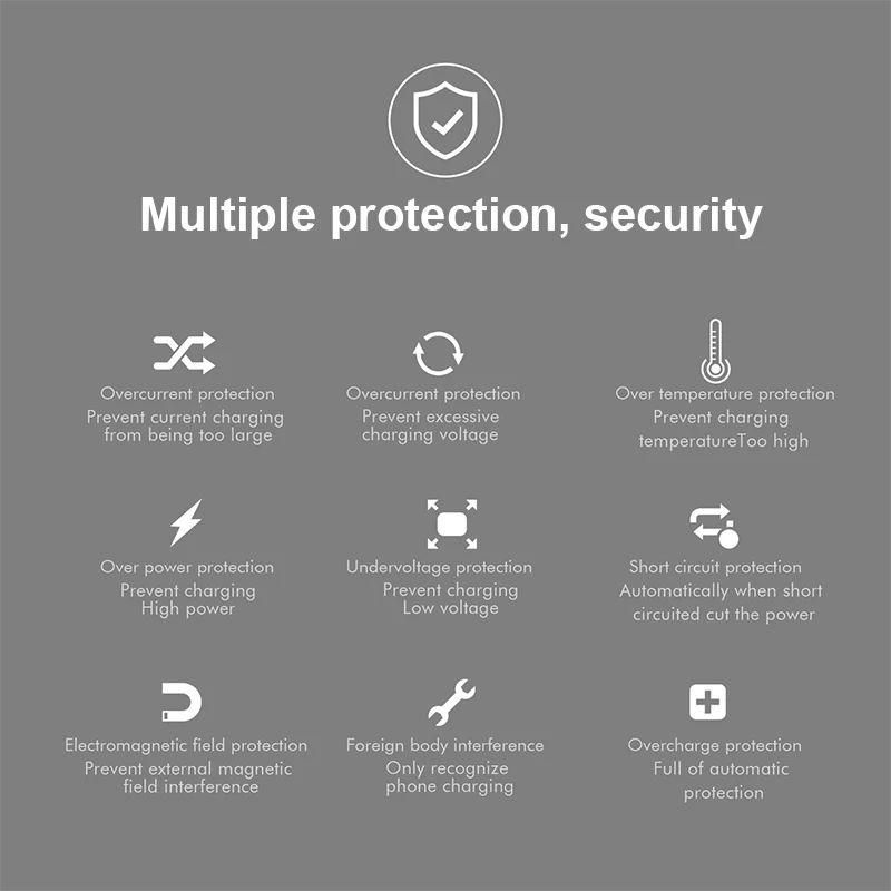 The 15W wireless fast charger comes with an intelligent chip and multi-protection systems to keep your device safe while charging.
