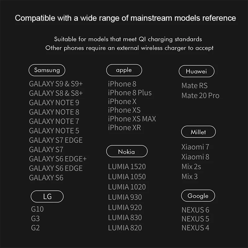 Using Qi wireless charging standard, it offers four wireless charging modes,5W normal charging mode, 7.5W, 10W, and up to 15W fast wireless charging mode for your phone.