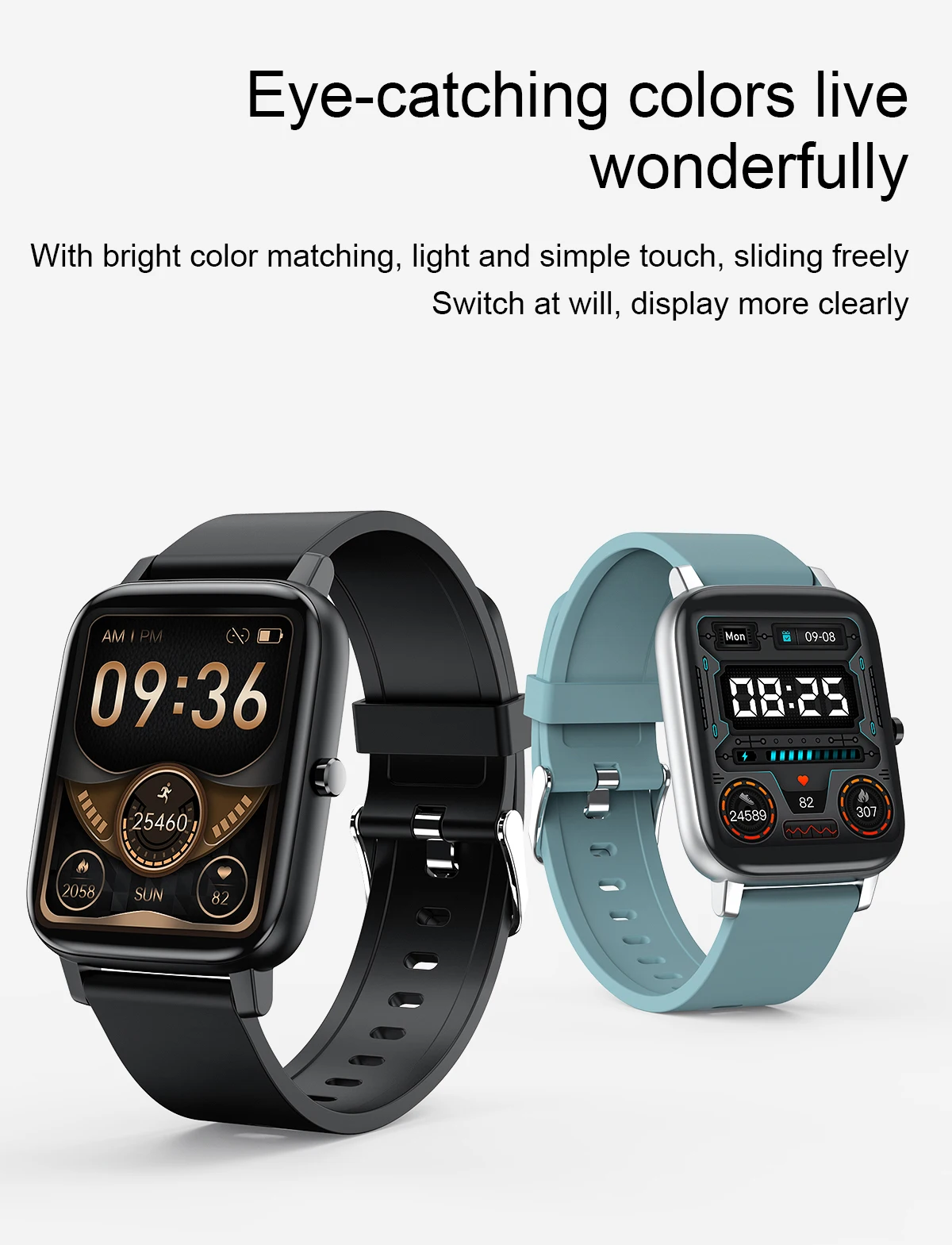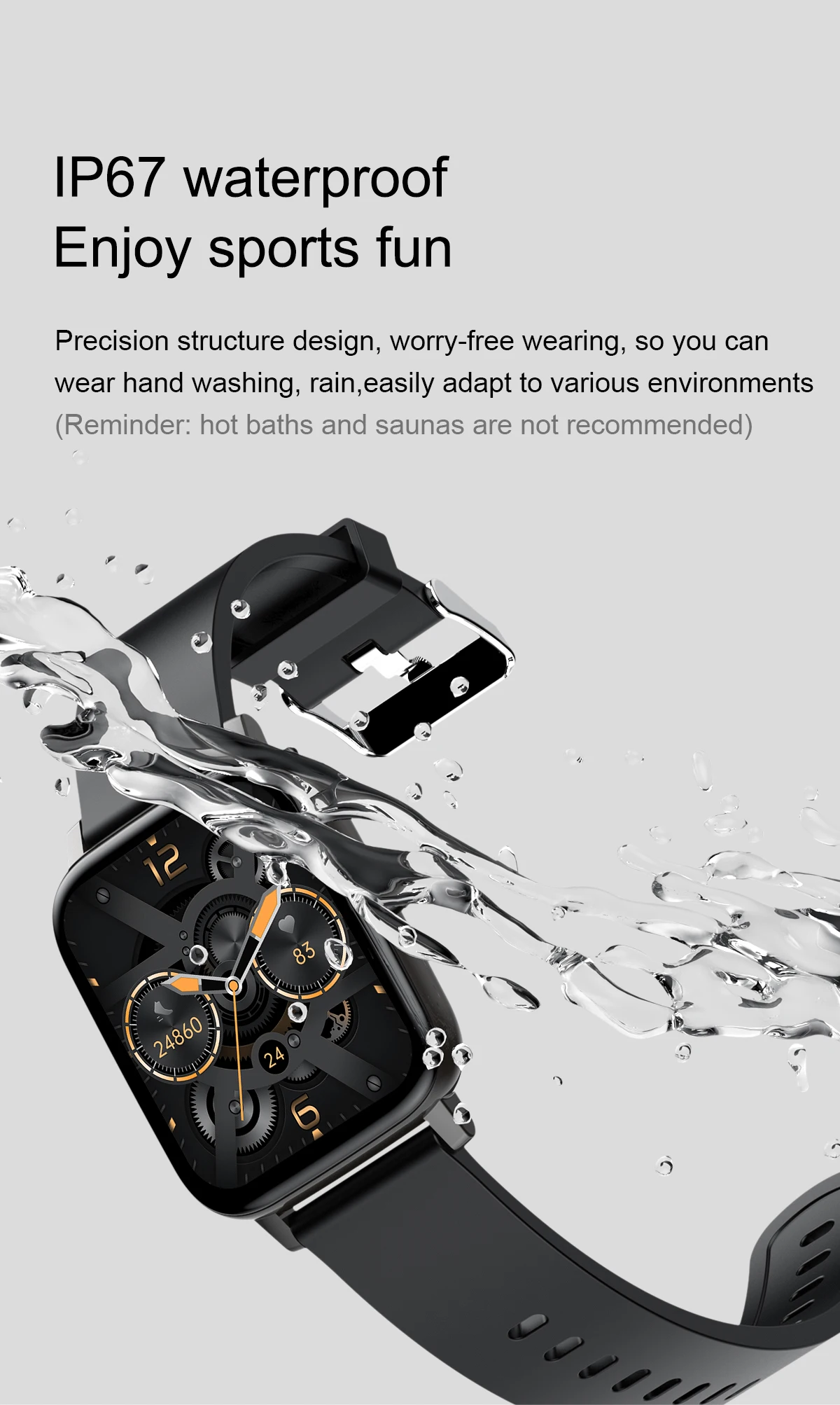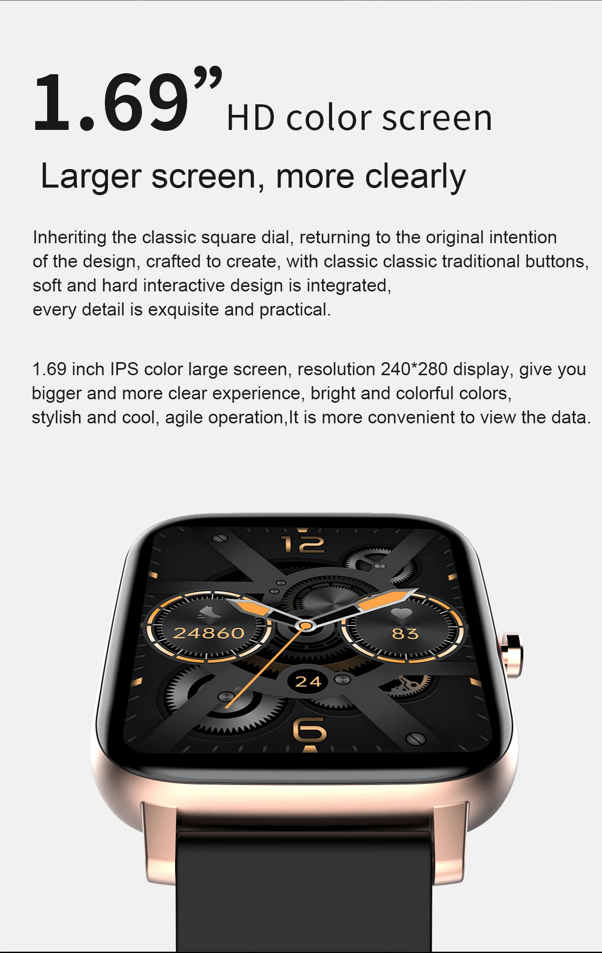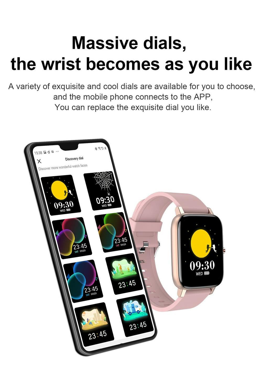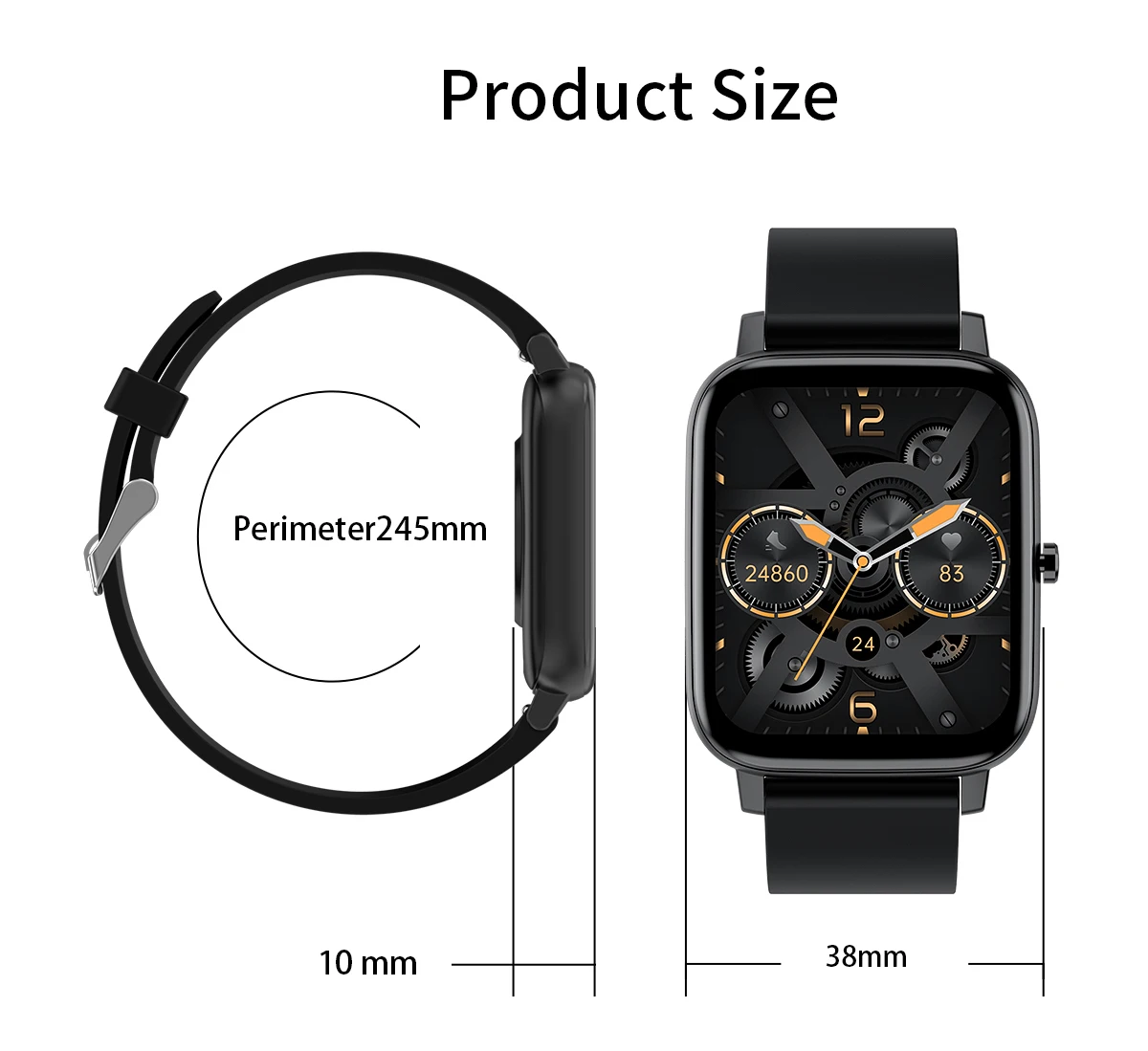 Basic Parameter : Watch size : 43.6*36*9.4mm Screen size : 1.69" TFT Resolution : 240*280 IPS Touch type : Full screen touch Color : Black, Blue, Pink, grey Wristband size : Total length 220mm, adjustable length 145-190mm Appearance material : Main body: zinc alloy + spherical toughened glass Wrist strap: silicone watch strap Hardware parameter : Chipset Supplier : RealTek Chipset : 8762C Mobile software app : Gloryfit Compatible System : Android4.4 (inclusive) or above, IOS9.0 (inclusive) or above FLASH memory : RAM:160K ROM:384KB FLASH: 64Mbit Connection parameter : Bluetooth 5.0 Battery capacity : 180mAh Charging time : about 2 honors Life time : Use for 7days, standby for 30 days Major function: Custom dial,weather forecast, step counting, heart rate, sleep, sedentary, mileage, blood oxygen, blood pressure, search, calories, Bluetooth, message push Software features : (APP:Gloryfit) Massive dial download, upload photos, step counting, heart rate, sleep, sedentary, mileage, blood oxygen, blood pressure, mobile search, calories, Bluetooth, information, wechat, QQ and other push,Search function, alarm setting, water drinking reminder, gesture intelligent control, do not disturb mode, reminder mode Support 20 APP national languages: Simplified Chinese, traditional Chinese, English, French, Russian, Indonesian, German, Italian, Czech, Japanese, polish, Portuguese, Spanish, Arabic, Korean Package Contents: 1 x Smart Watch 1 x Manual 1 x USB Charging Cable