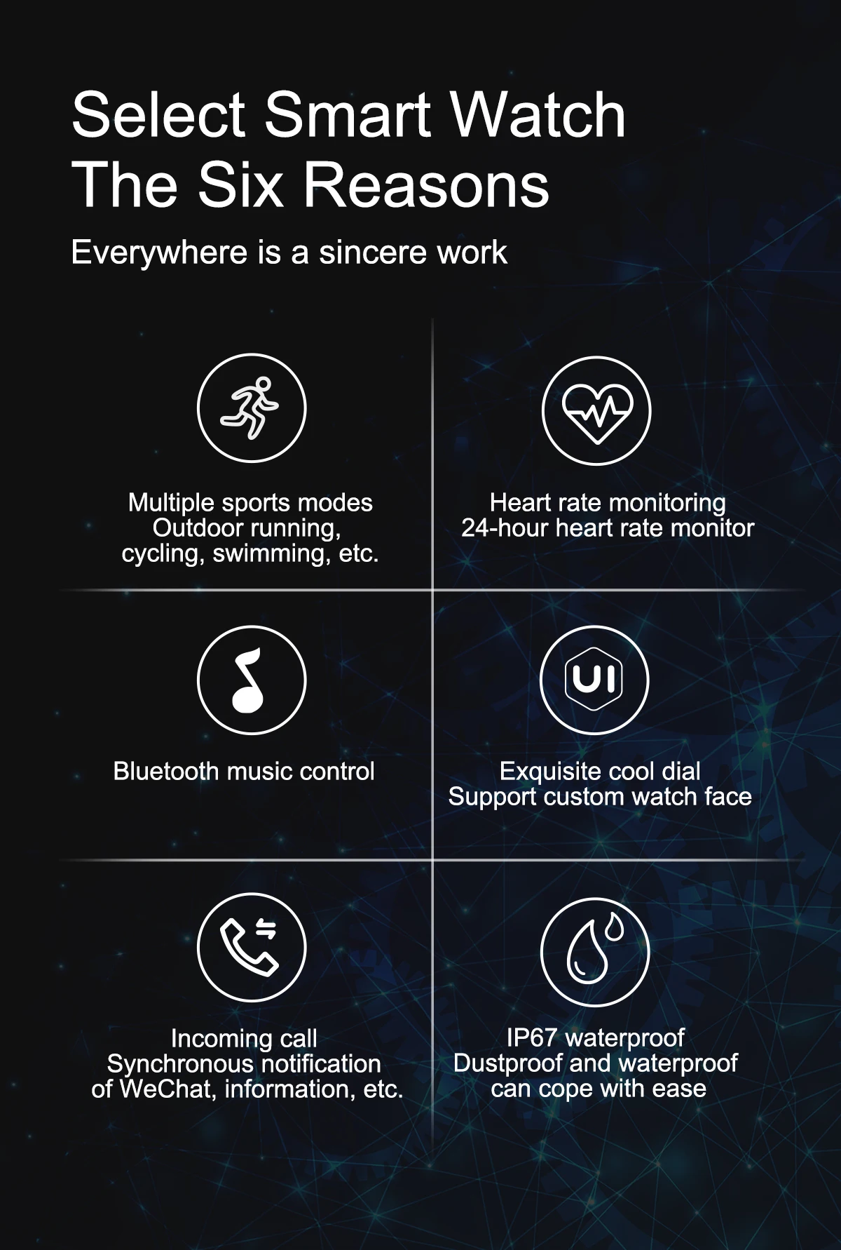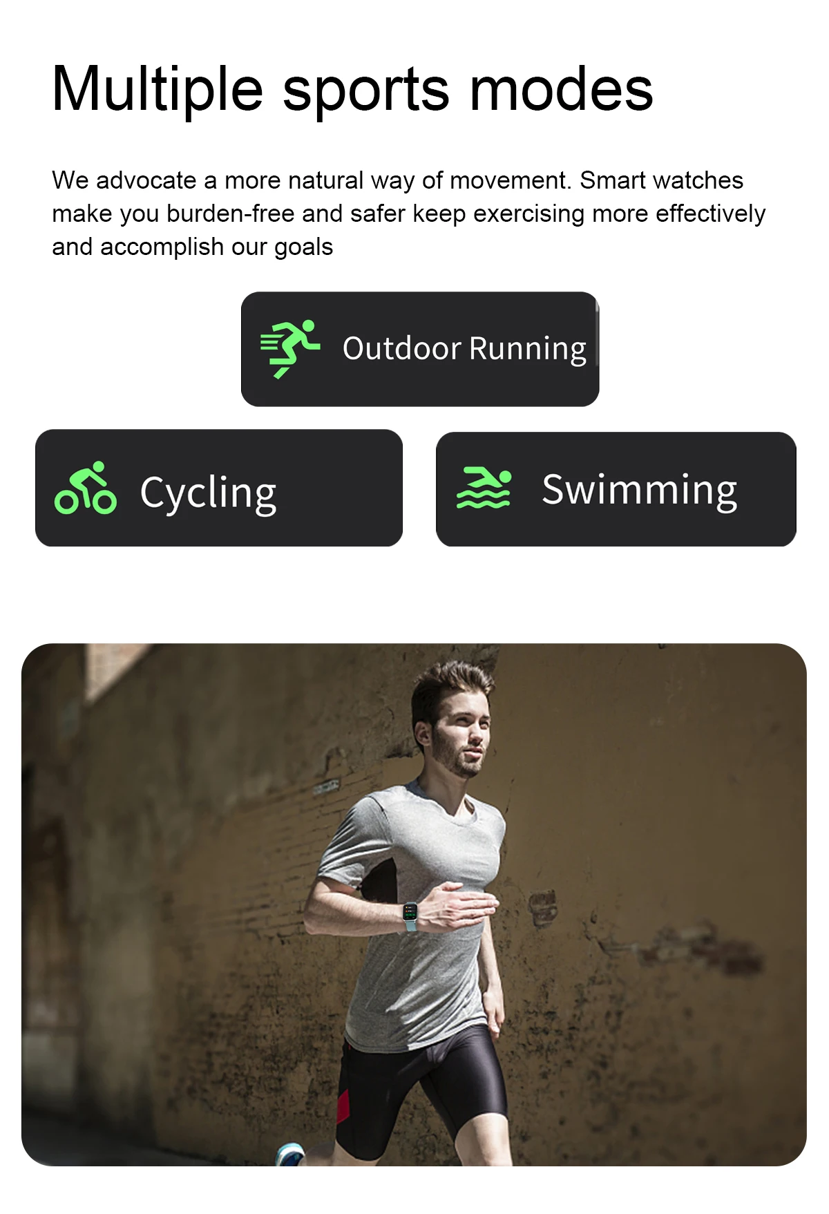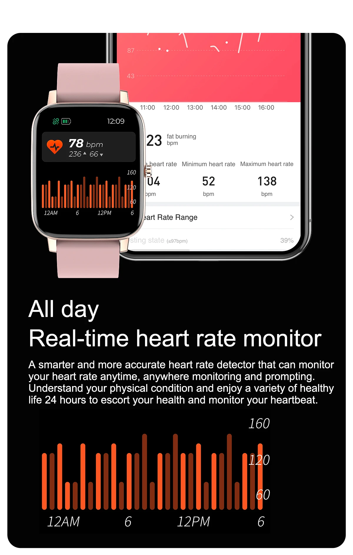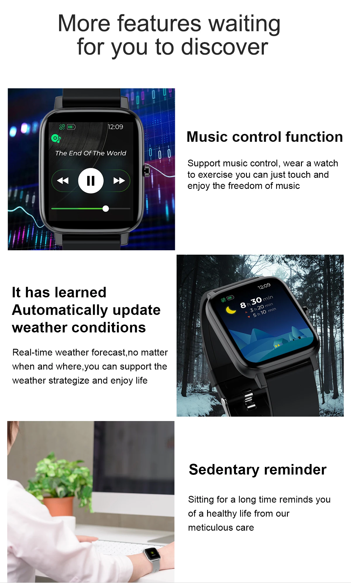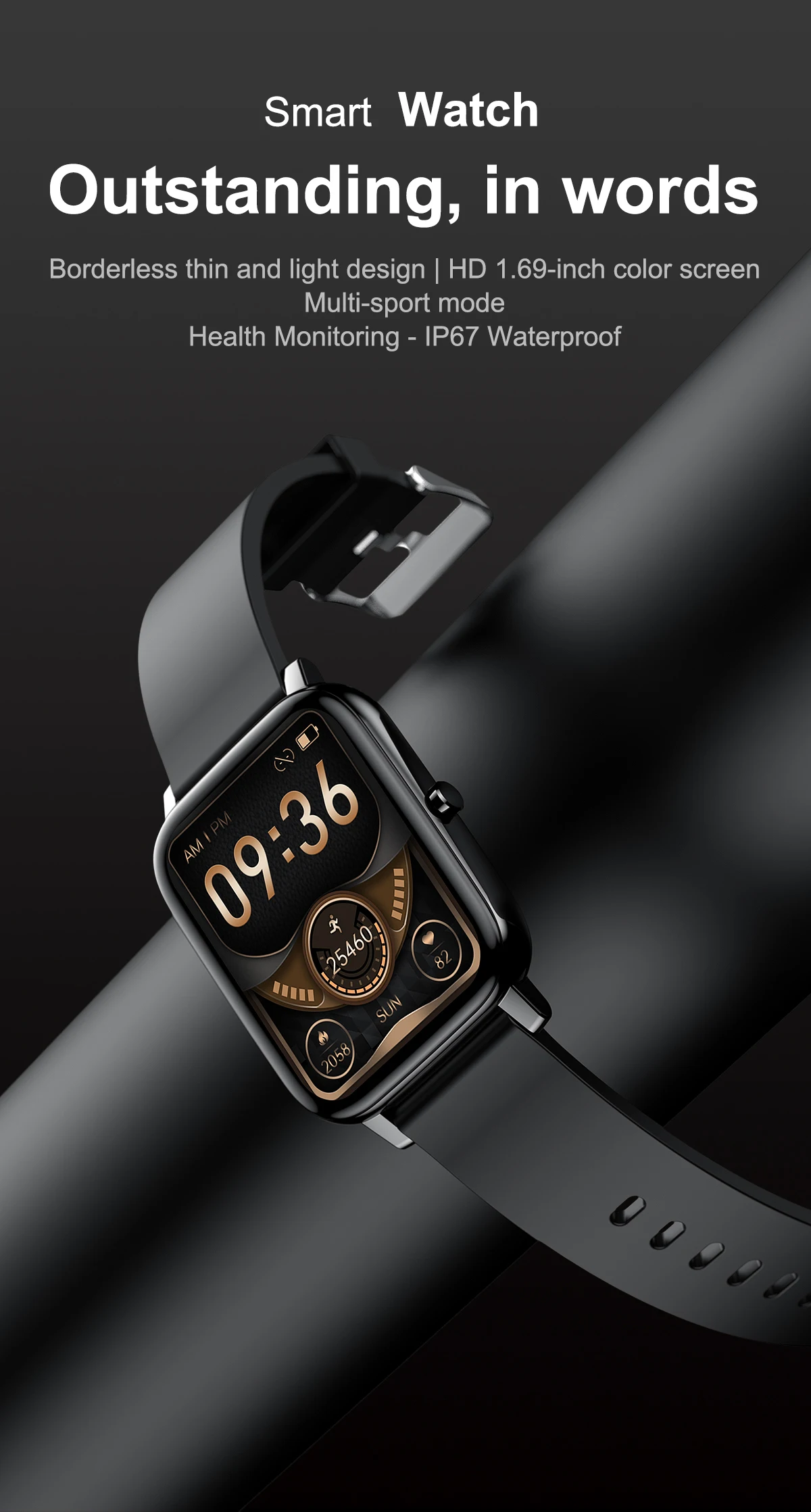 Basic Parameter : Watch size : 43.6*36*9.4mm Screen size : 1.69" TFT Resolution : 240*280 IPS Touch type : Full screen touch Color : Black, Blue, Pink, grey Wristband size : Total length 220mm, adjustable length 145-190mm Appearance material : Main body: zinc alloy + spherical toughened glass Wrist strap: silicone watch strap Hardware parameter : Chipset Supplier : RealTek Chipset : 8762C Mobile software app : Gloryfit Compatible System : Android4.4 (inclusive) or above, IOS9.0 (inclusive) or above FLASH memory : RAM:160K ROM:384KB FLASH: 64Mbit Connection parameter : Bluetooth 5.0 Battery capacity : 180mAh Charging time : about 2 honors Life time : Use for 7days, standby for 30 days Major function: Custom dial,weather forecast, step counting, heart rate, sleep, sedentary, mileage, blood oxygen, blood pressure, search, calories, Bluetooth, message push Software features : (APP:Gloryfit) Massive dial download, upload photos, step counting, heart rate, sleep, sedentary, mileage, blood oxygen, blood pressure, mobile search, calories, Bluetooth, information, wechat, QQ and other push,Search function, alarm setting, water drinking reminder, gesture intelligent control, do not disturb mode, reminder mode Support 20 APP national languages: Simplified Chinese, traditional Chinese, English, French, Russian, Indonesian, German, Italian, Czech, Japanese, polish, Portuguese, Spanish, Arabic, Korean Package Contents: 1 x Smart Watch 1 x Manual 1 x USB Charging Cable