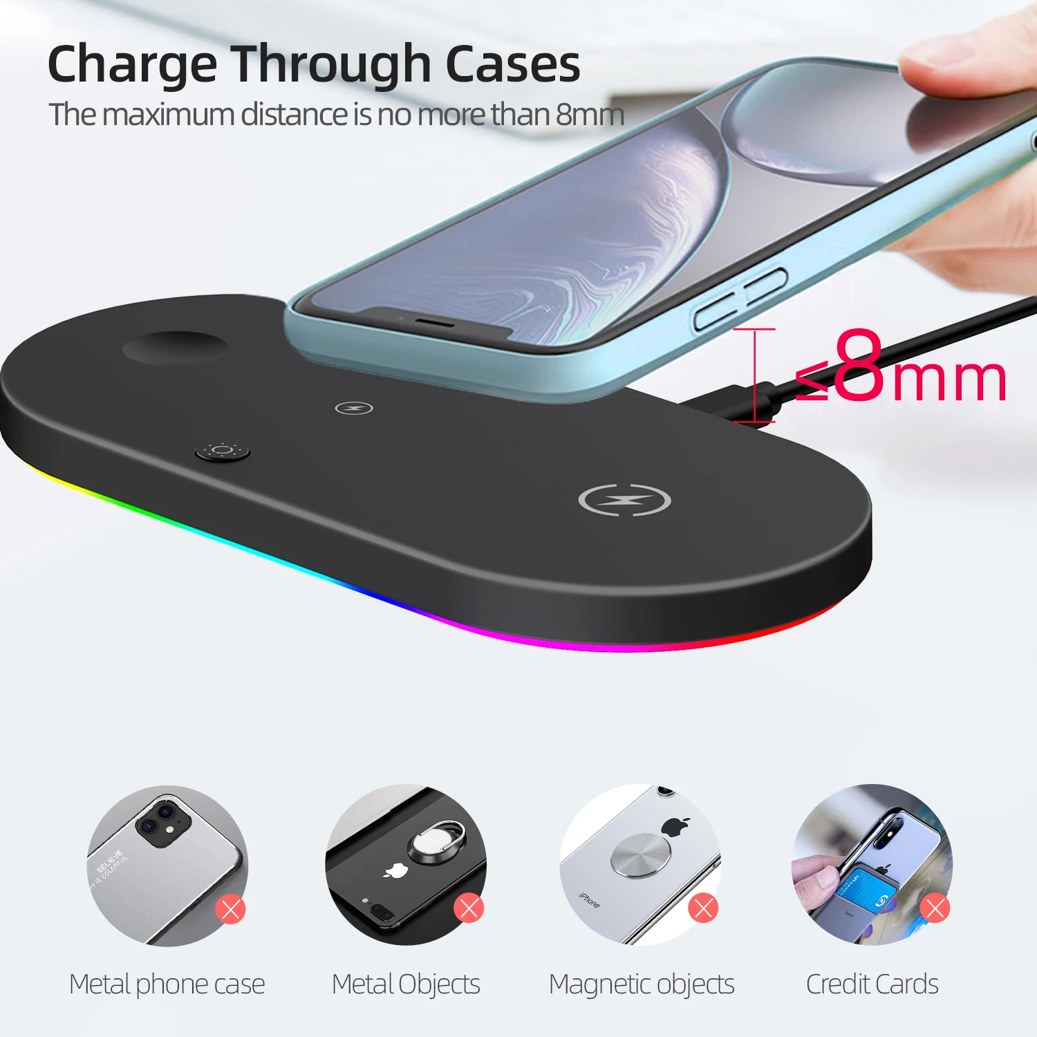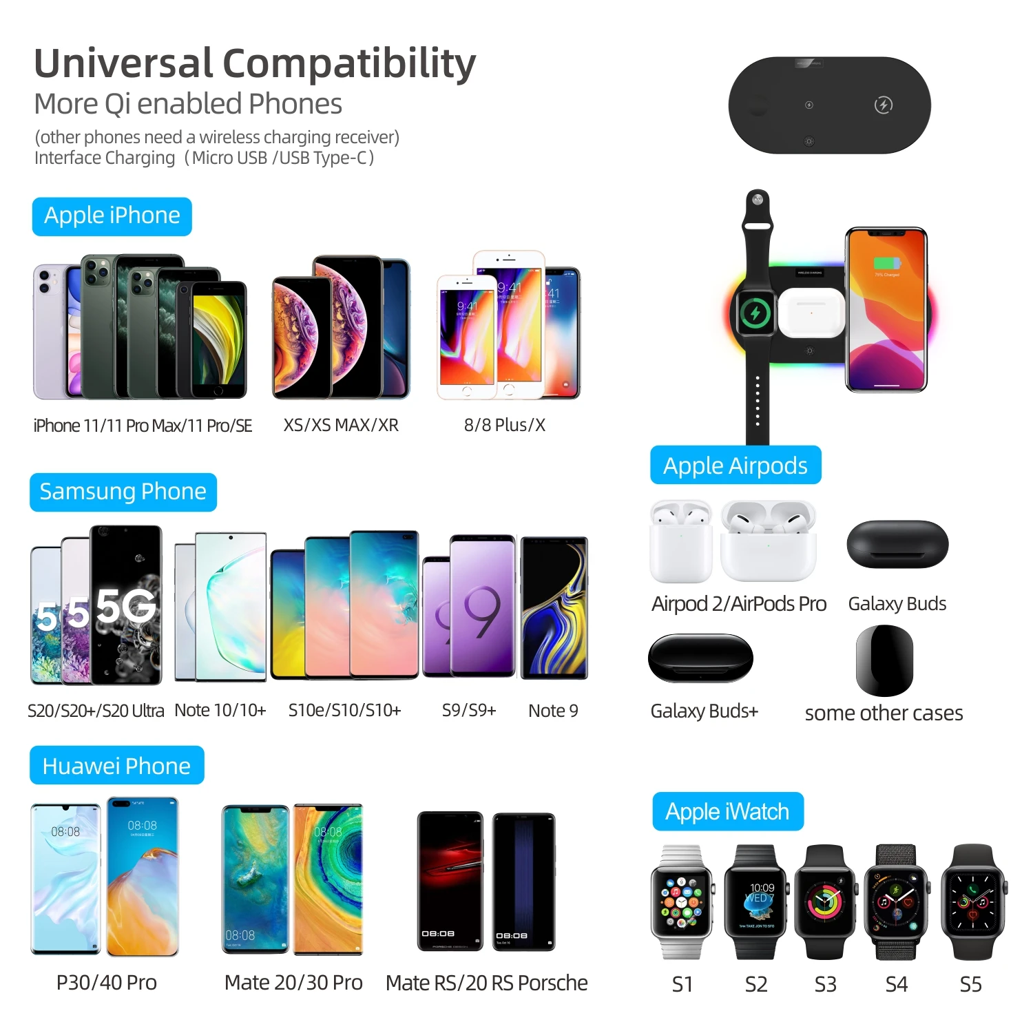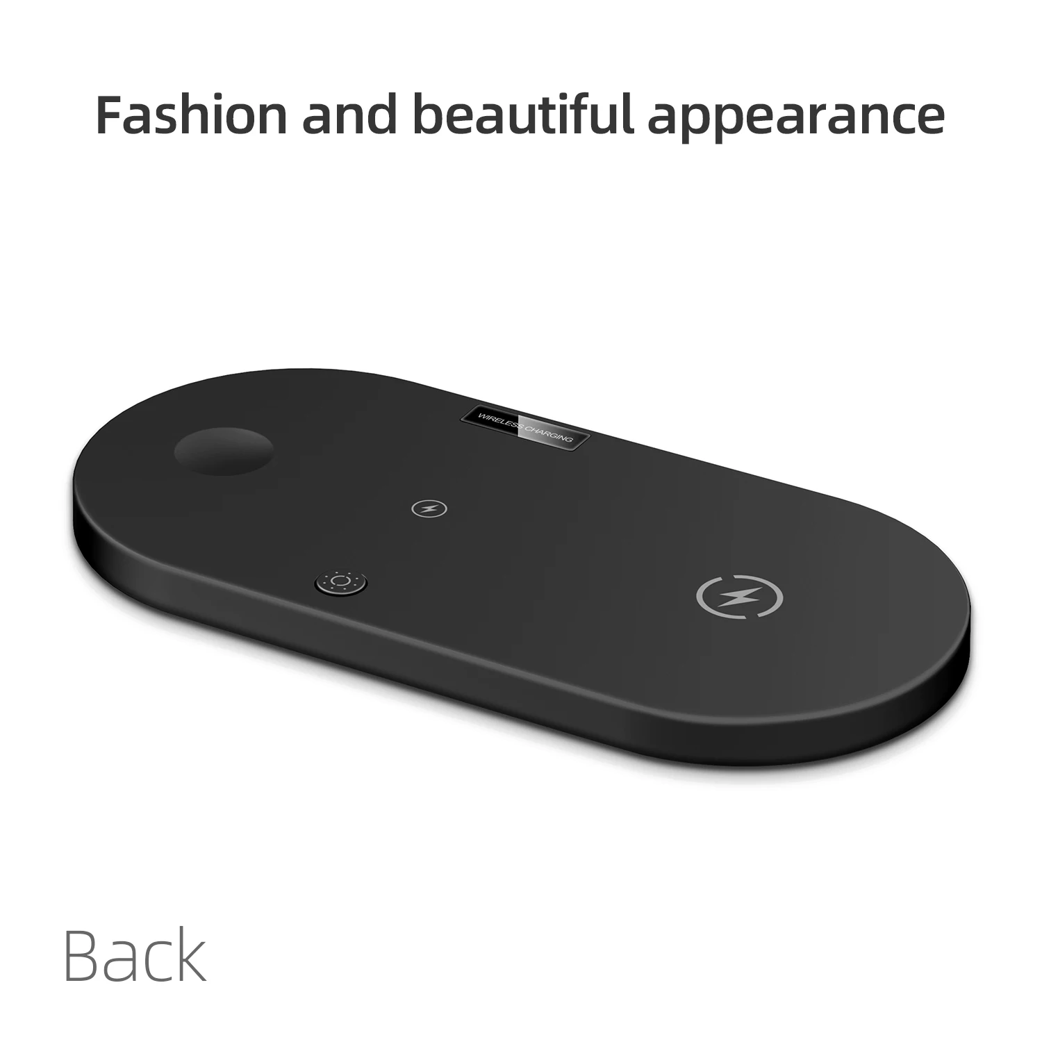 *Material: plastic silicon *Input: 5V 2A / 9V 2A or 12V/2A *Phones output : 5 W / 7.5 W /10W/15W *Headphones output:3W Max *Watch Power: 2.5 W (Max.) *Input:Type-C *Transmission distance:≤ 8MM *Charging Efficiency:≥73% *Color:Black,White