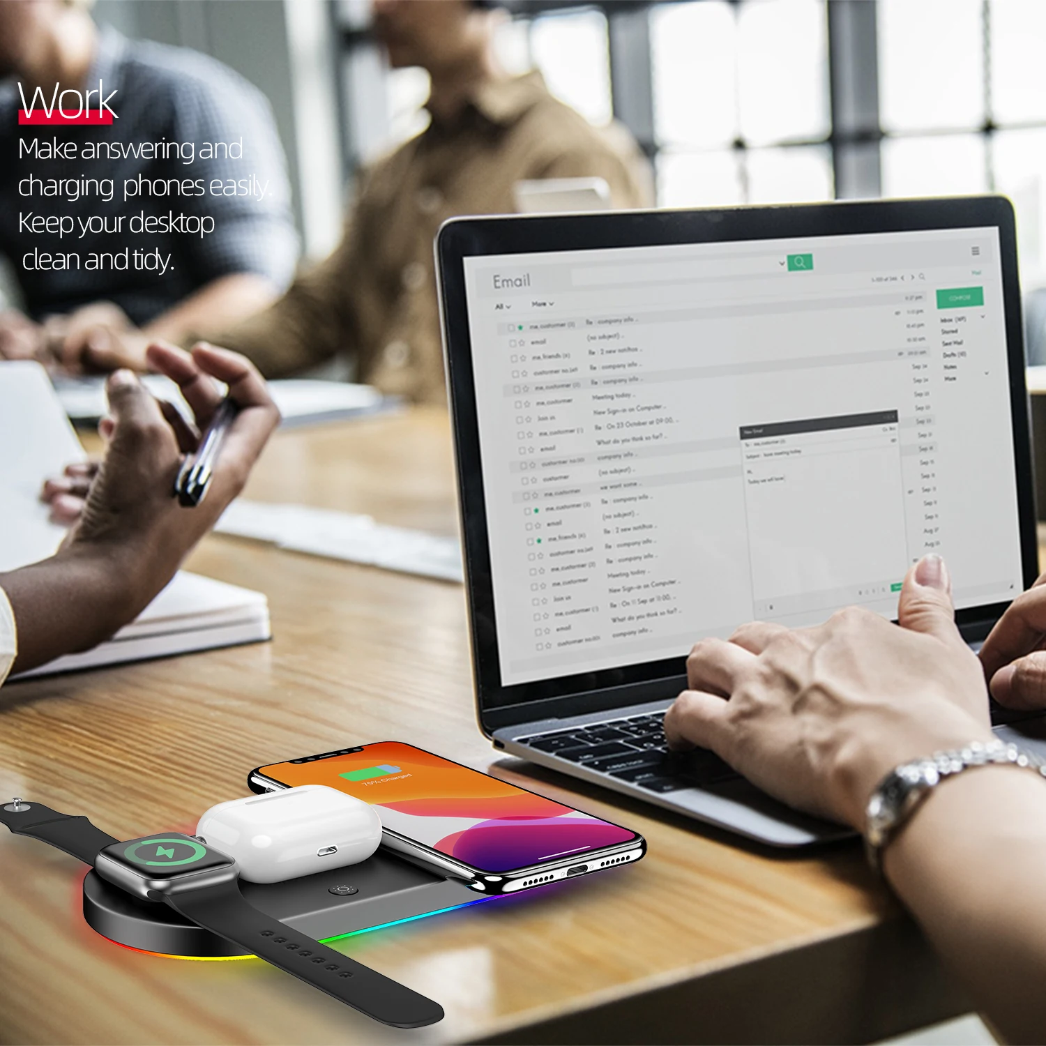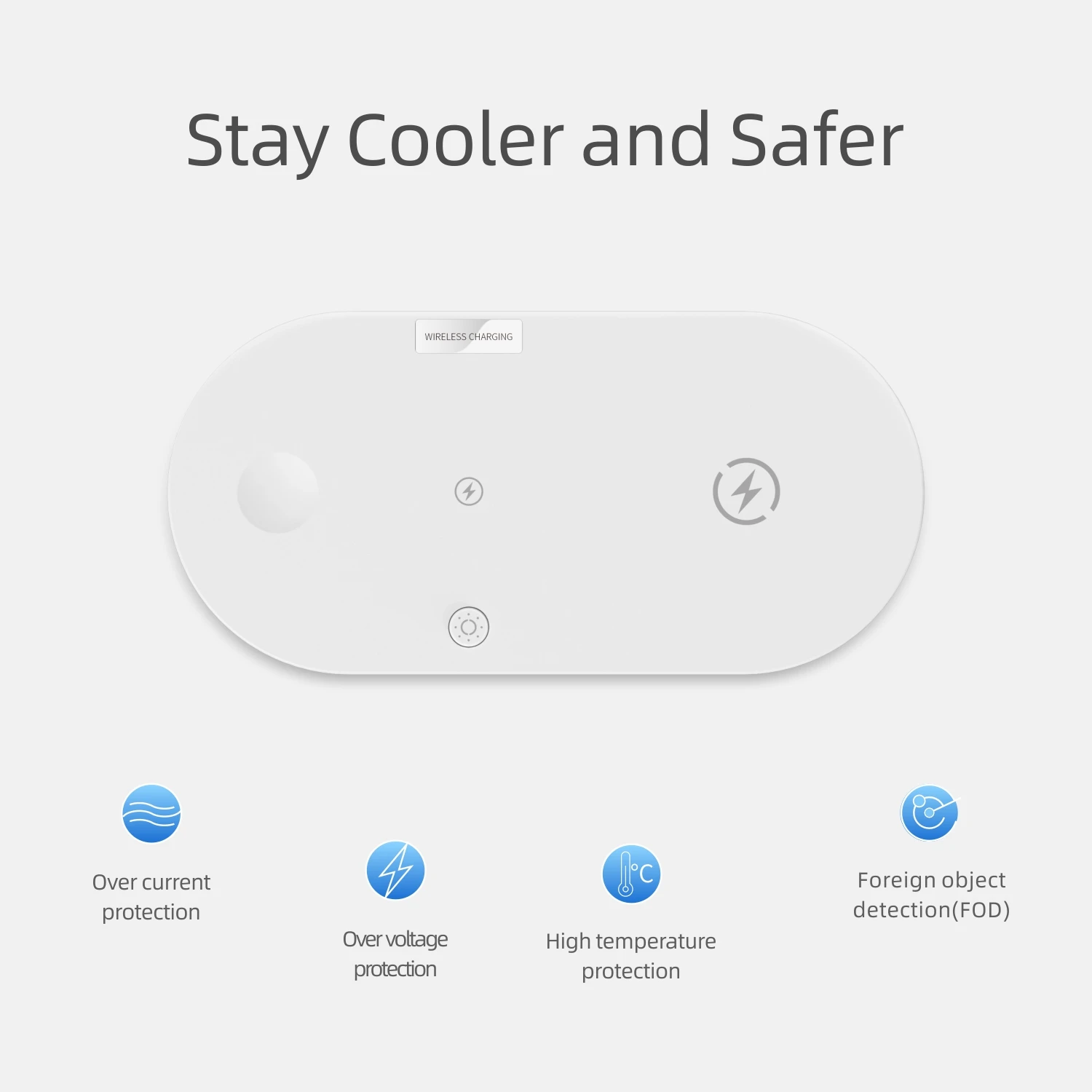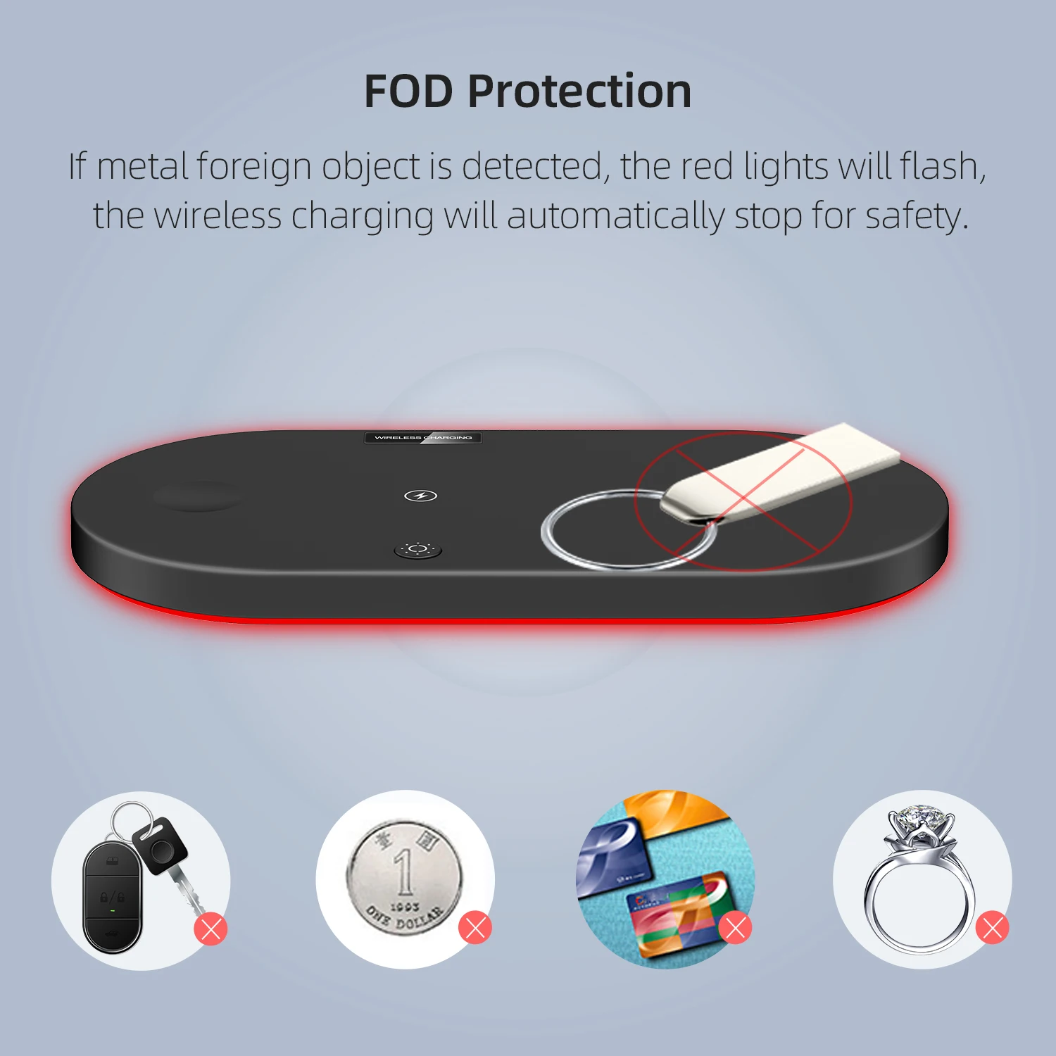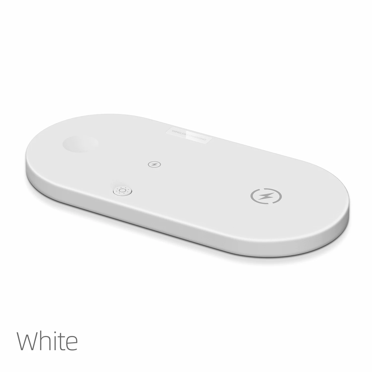 *Material: plastic silicon *Input: 5V 2A / 9V 2A or 12V/2A *Phones output : 5 W / 7.5 W /10W/15W *Headphones output:3W Max *Watch Power: 2.5 W (Max.) *Input:Type-C *Transmission distance:≤ 8MM *Charging Efficiency:≥73% *Color:Black,White