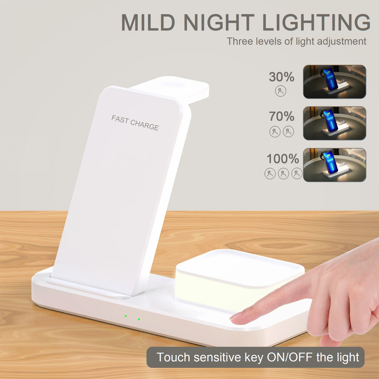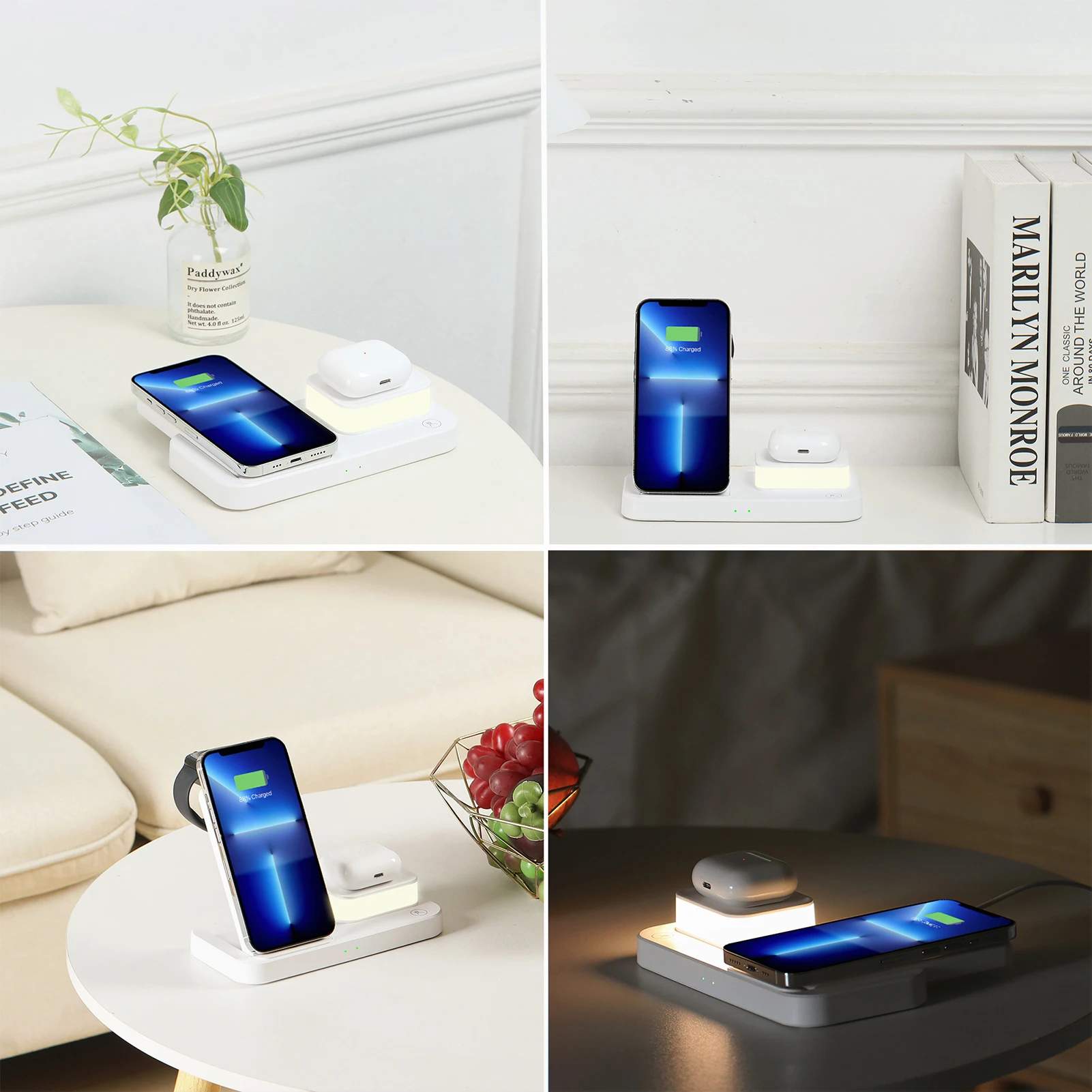 1. Upgraded 3 in 1 Charging Station: charge your phone, Watch and air-pods simultaneously, making your desk look simpler and neat.