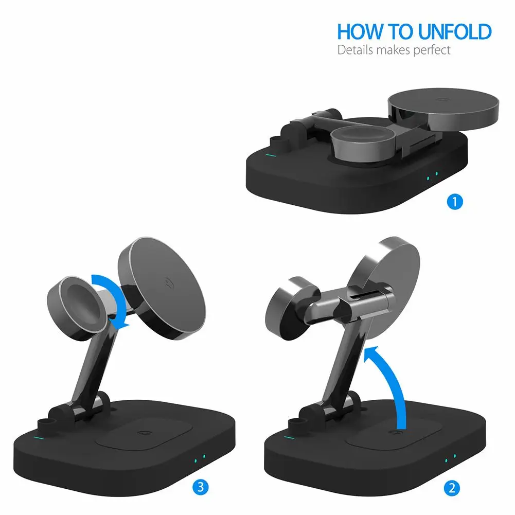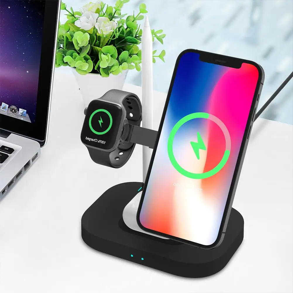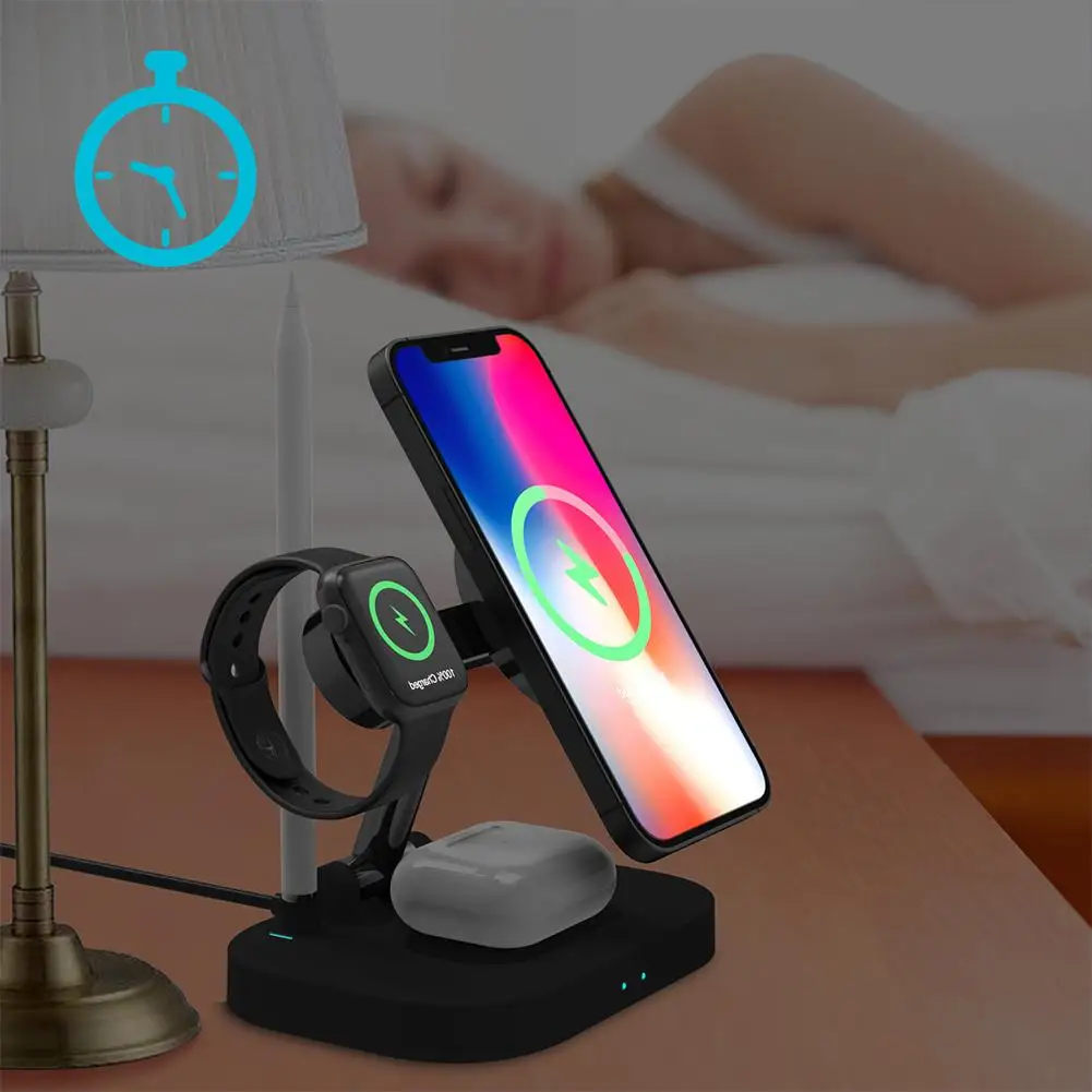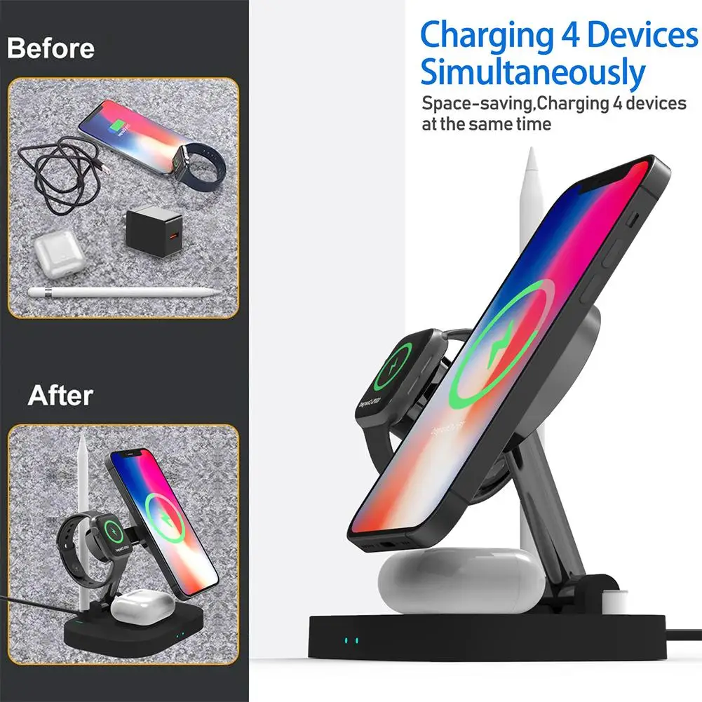 1. 4-in-1 wireless charging stand can charge four electronic devices at the same time, for example: compatible for iphone12 & 13 series + compatible for iwatch series + compatible for airpods2 / Pro / 3 + compatible for ipencil 1.
