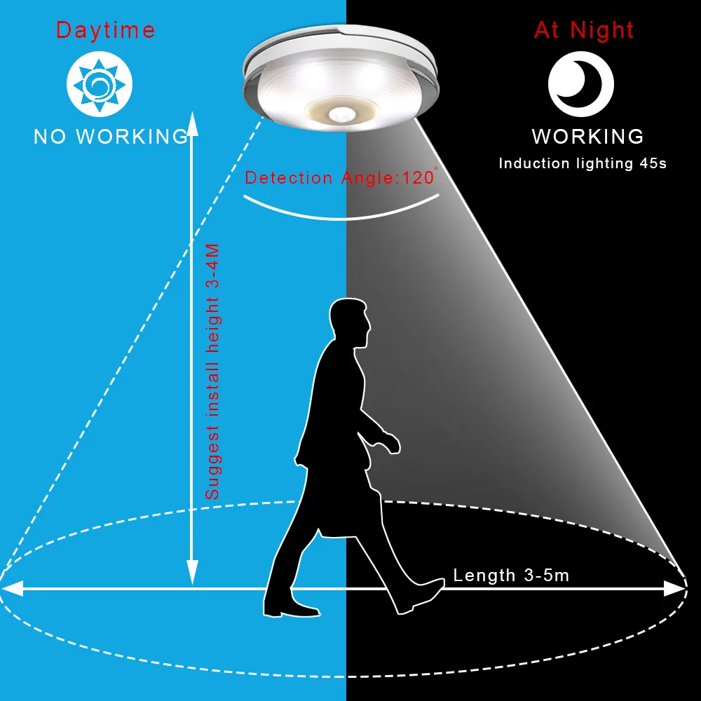 Human body sensing: 4000K color temperature, human body sensing + optical sensing integration, sensing distance 5M. Sensing time 40s. (Note: The lighting will automatically enter the sensor mode only at night or when it is dark).