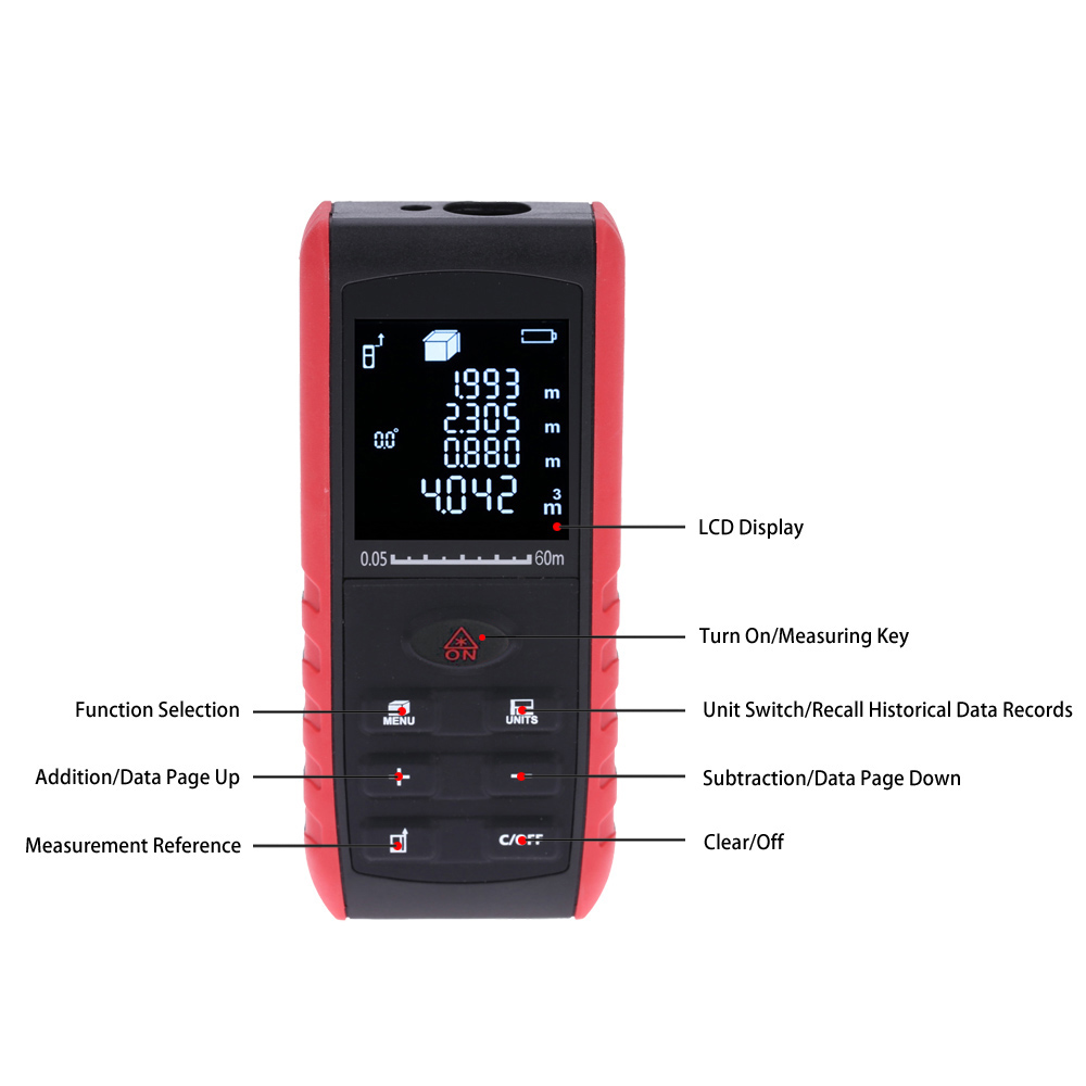 The laser distance meter with high precision can be used to measure the distance, area and volume. It also can be used for indirect measurement by Pythagorean theorem. The product is portable and reliable in measuring, making your measurement more accurate, simple and faster. The meter can be widely used in construction and industries, especially in large areas such as rooms, apartments, buildings, real estates, factories, etc