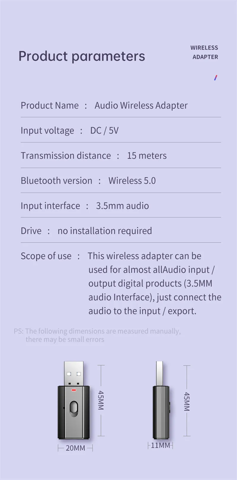 5.Broad Compatibility: With the included 3.5mm cable  this Receiver Transmitter adapter can widely be used on your car,computer, laptop, home stereo system, headphone, smartphone, Mp3 player, CD player, etc.
