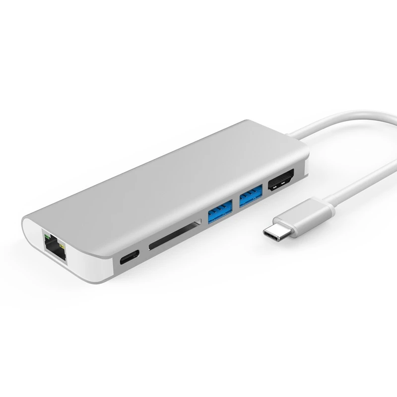 USB-C Hub with 4 k 30Hz 1 HDMI port, 2x5 Gbps USB 3.0 ports, 1x SD memory card, 1x USB C Port Charging, 1x1000 M Ethernet port.