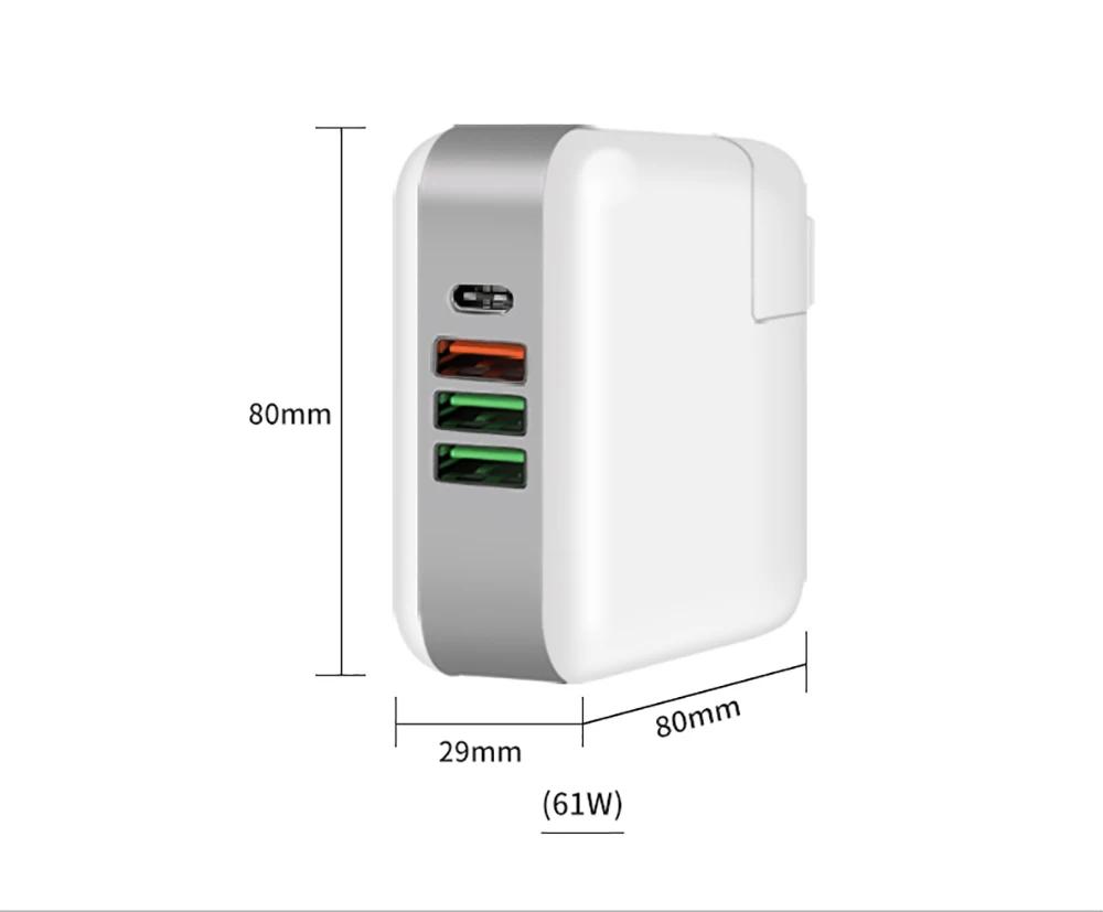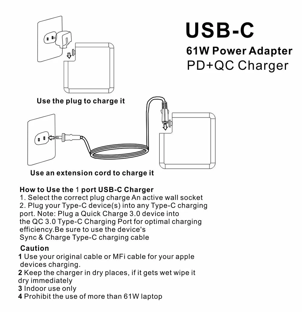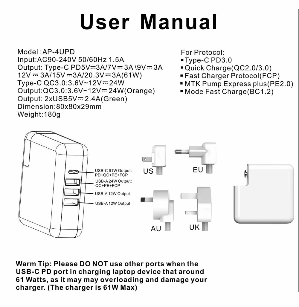 - Warm Tip: DO NOT use any other ports when the USB-C PD port in charging laptop device that is around 61 watts, if it can overload and damage your charger. (The charger is 61w Max)