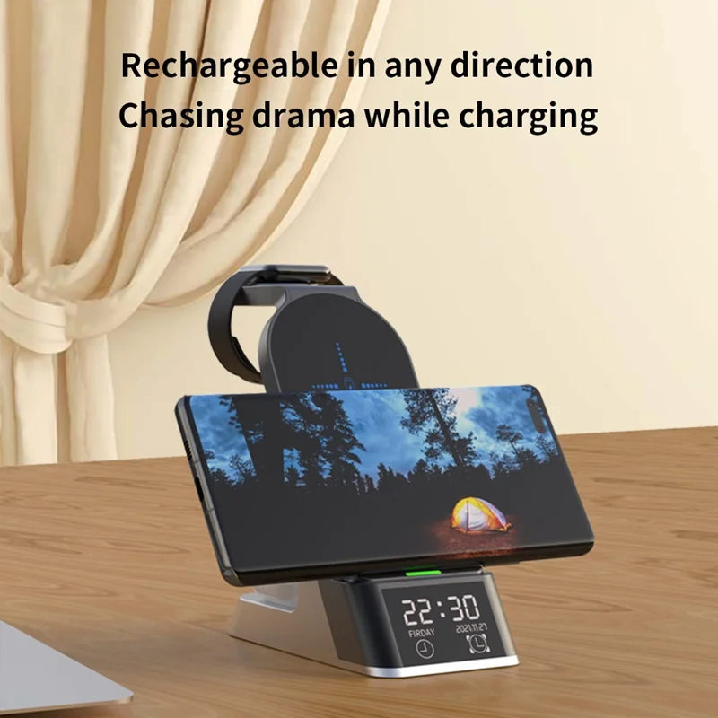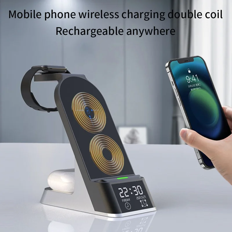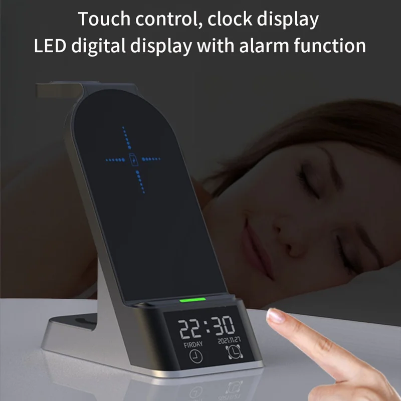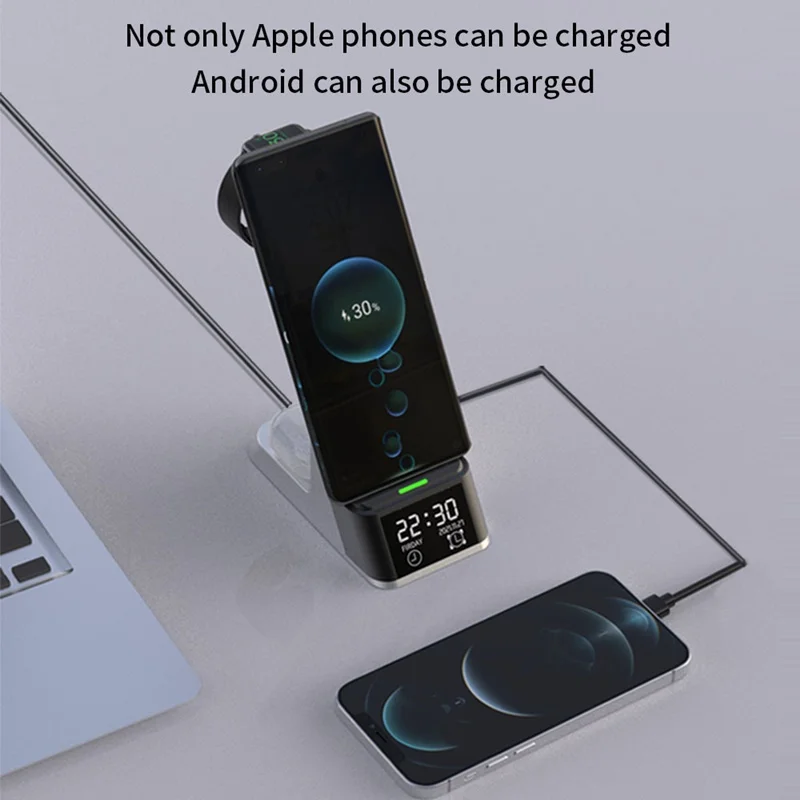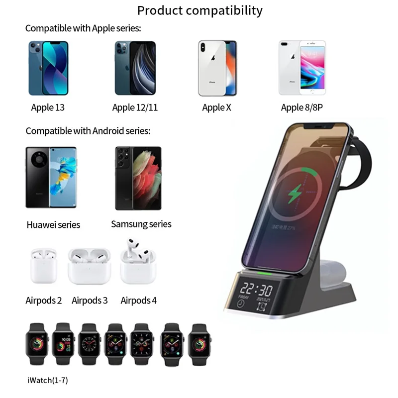 6 IN 1 Alarm Clock Wireless Charger Stand For Airpods Pro Apple Watch 7 6 5 4 3 2 1 15W Fast Charging Station For Iphone XR XS 11 12 13 Pro Max