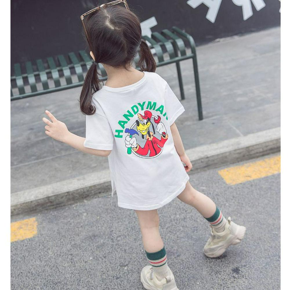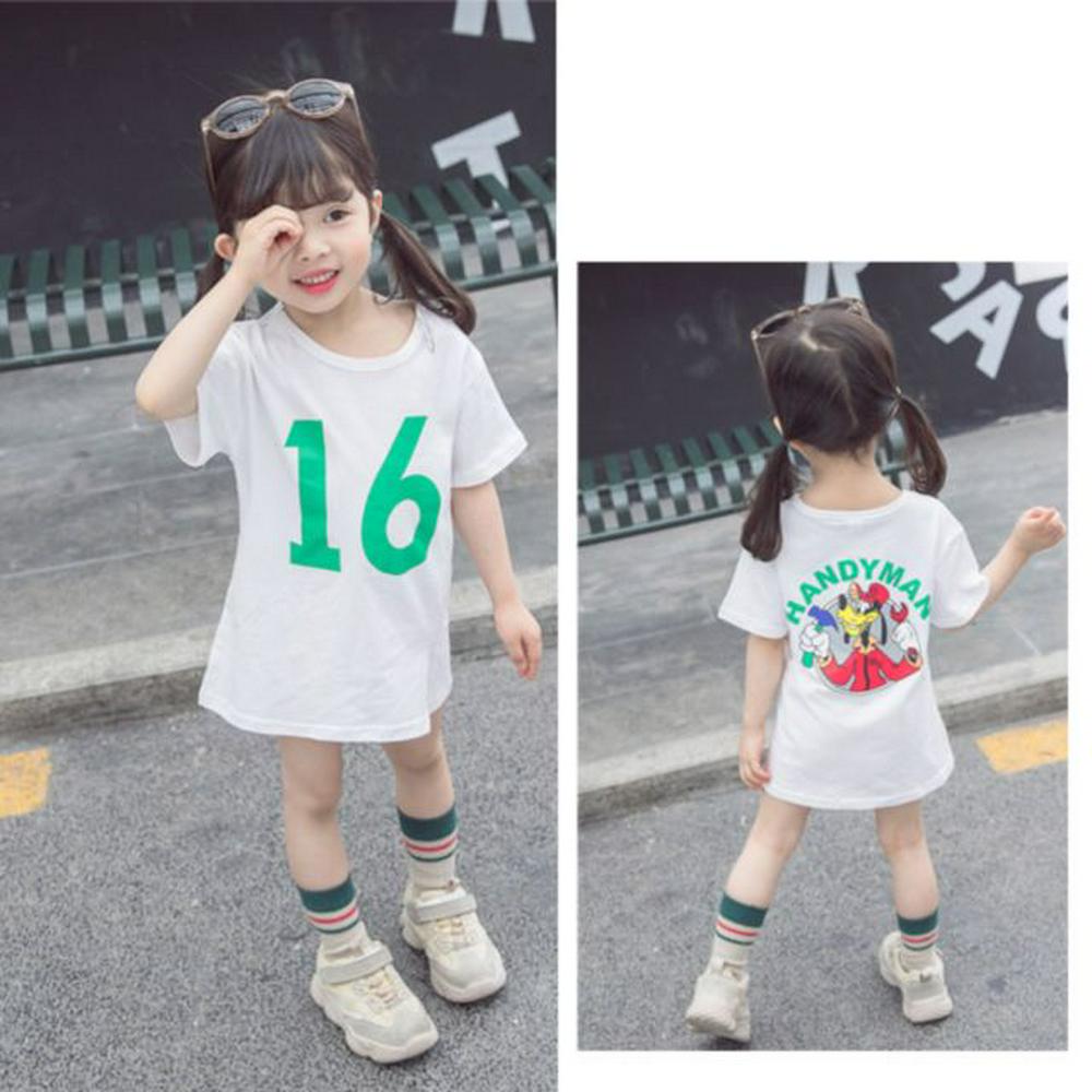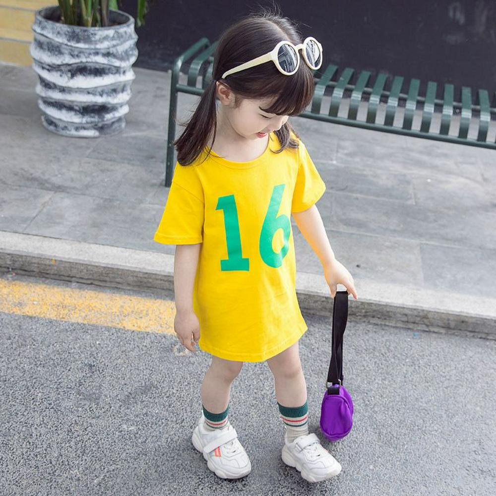 80-130cm Digital Pattern Children Girls Summer Stylish Pure Cotton Medium Long Style O-Neck Short Sleeves T-Shirt Children Wear