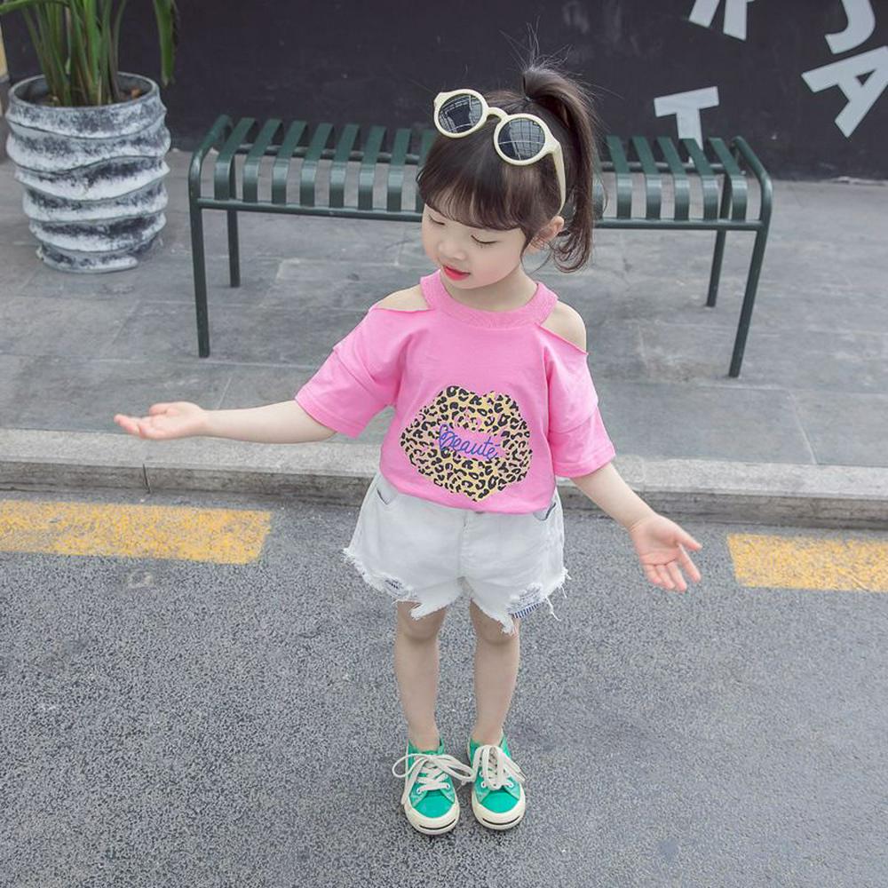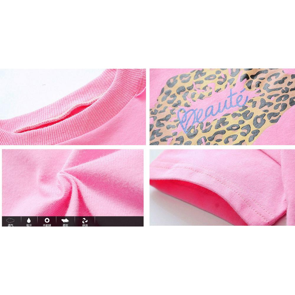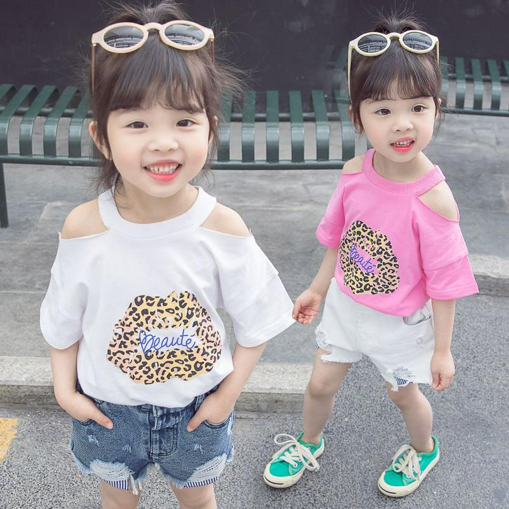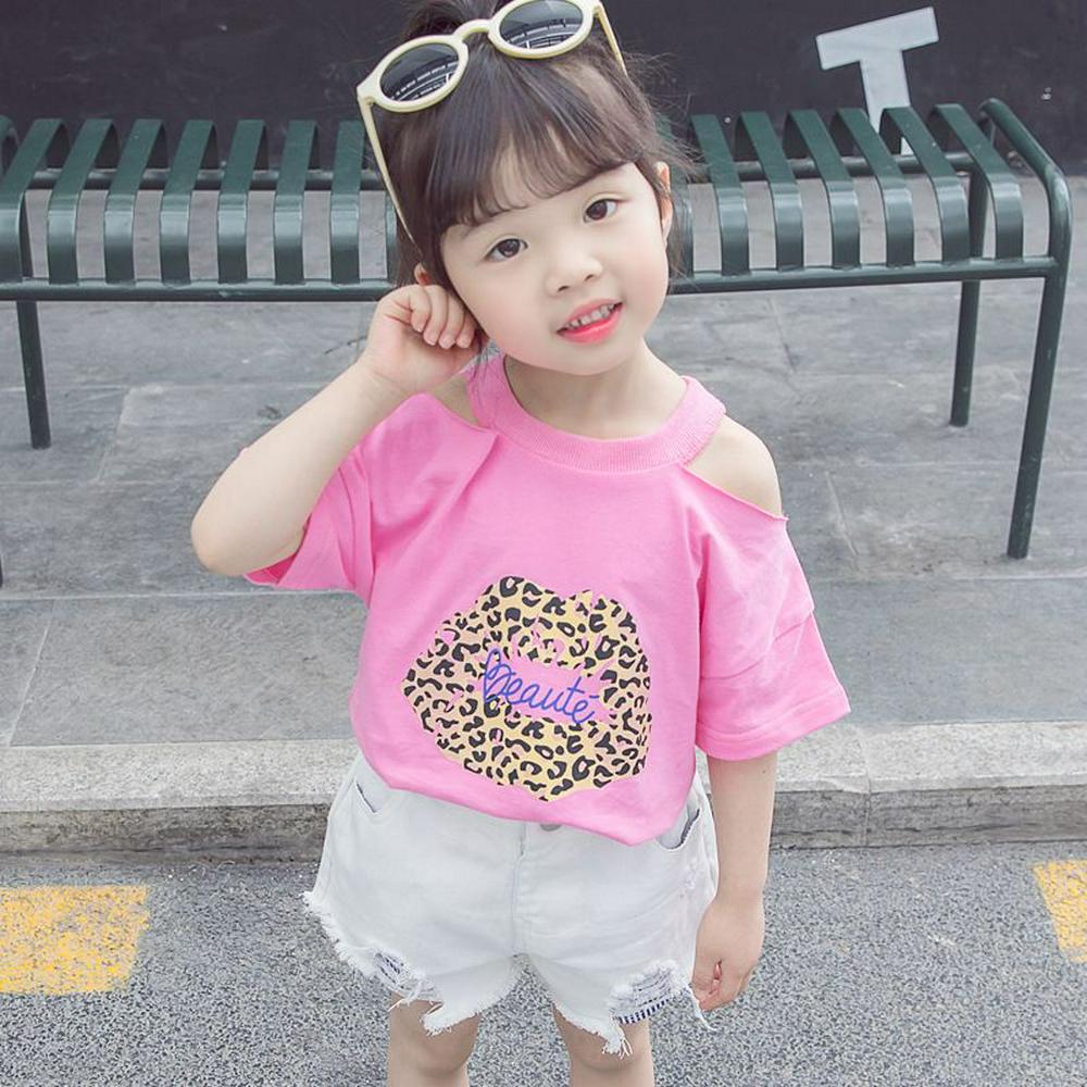80-130cm Leopard Pattern Children Girls Summer Stylish Pure Cotton Strapless O-Neck Short Sleeves T-Shirt Children Wear