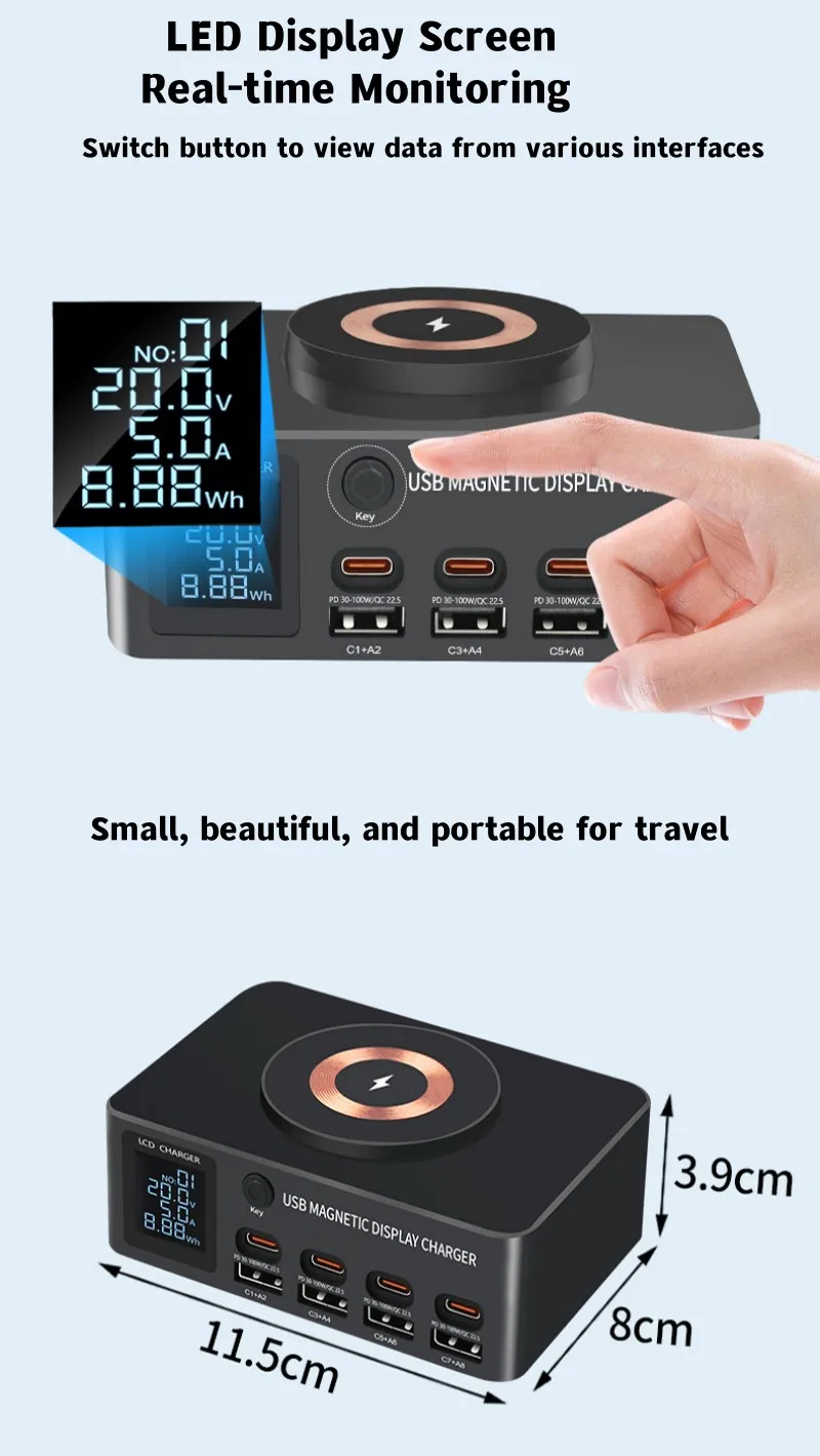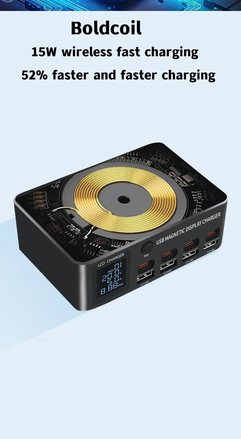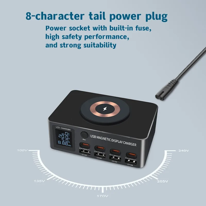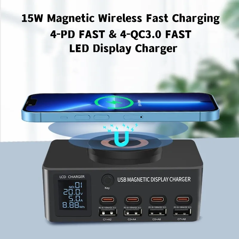 8Port 140W Type C USB Charger Station PD QC3.0 Multi Port Fast Charger With Display 15W Wireless Charger For iPhone iPad Samsung