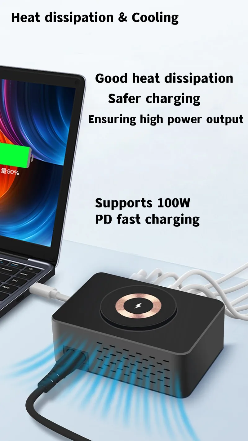 The product can automatically adjust the output power according to the needs of mobile phones, laptops and other charging devices, and adjust the charging power according to the storage status of the charging device When the total output power exceeds the rated power, the product will automatically protect (stop working, the indicator light flashes). after reducing the charging device, the charging state will be restored.