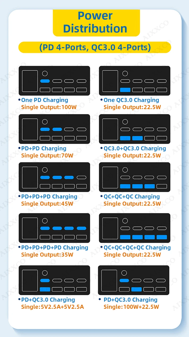 The maximum output power of PD port is 100W (charging line with E-Marker chip is required), the maximum output power of QC port is 30W (20V1.5A). the maximum output power of A+C port is 2.5A (automatic adaptive current).