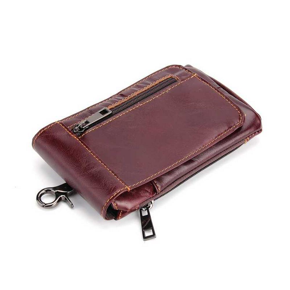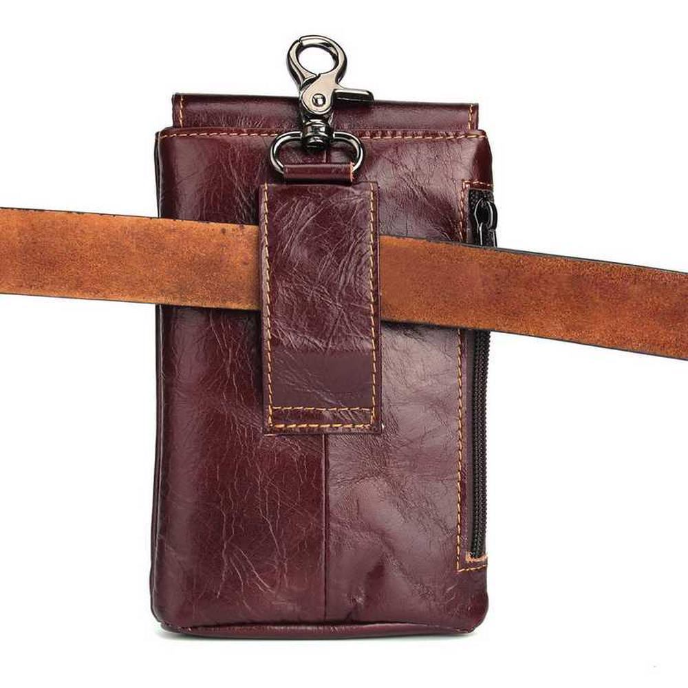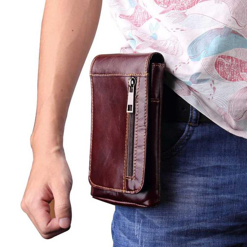 Crazy Horse Pattern Vertical Style 6.3 Inch First Layer Cowhide Leather with Belt Buckles and Detachable Rope Mini Mobile Phone Messenger Loose Change Men Waist Zipper Bag - Brown