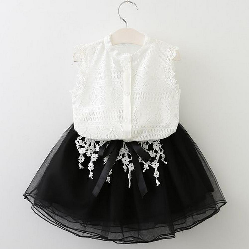 100/110/120/130/140cm Korean Children Girls Summer Stylish Sleeveless Lace Shirt + Mesh Short Skirt Children Wear Two Pieces Set - Black