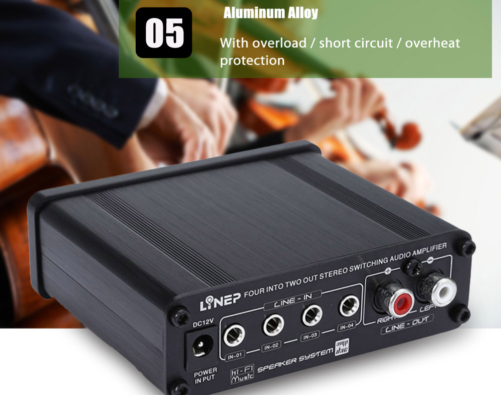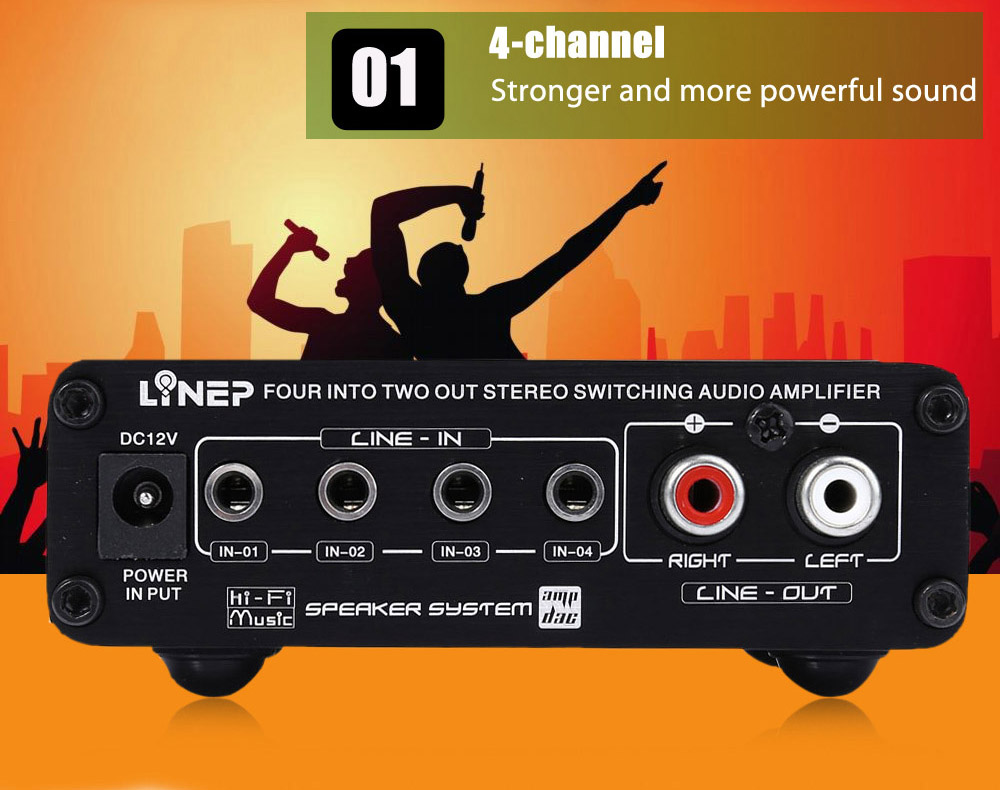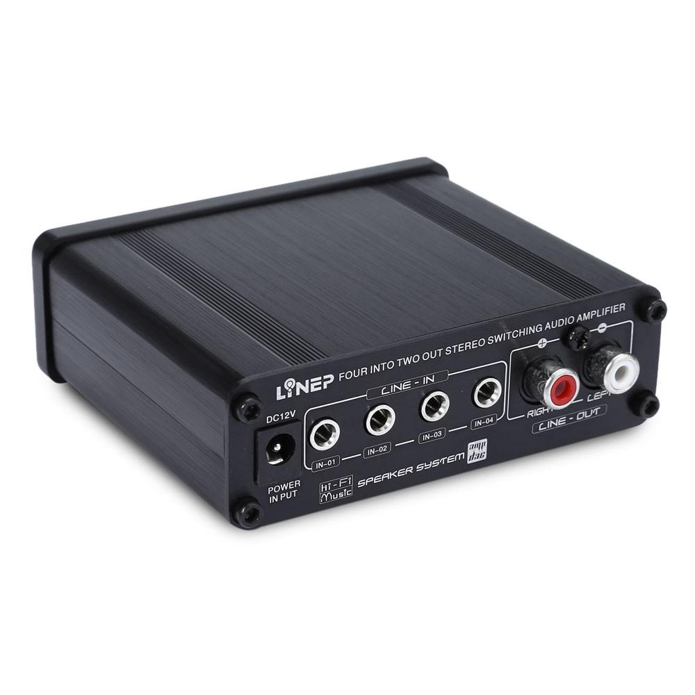 Four-channel switch circuit (3.5 headphone base and gilt RCA base) replaces input signal with no need to disconnect, just the panel switch option.