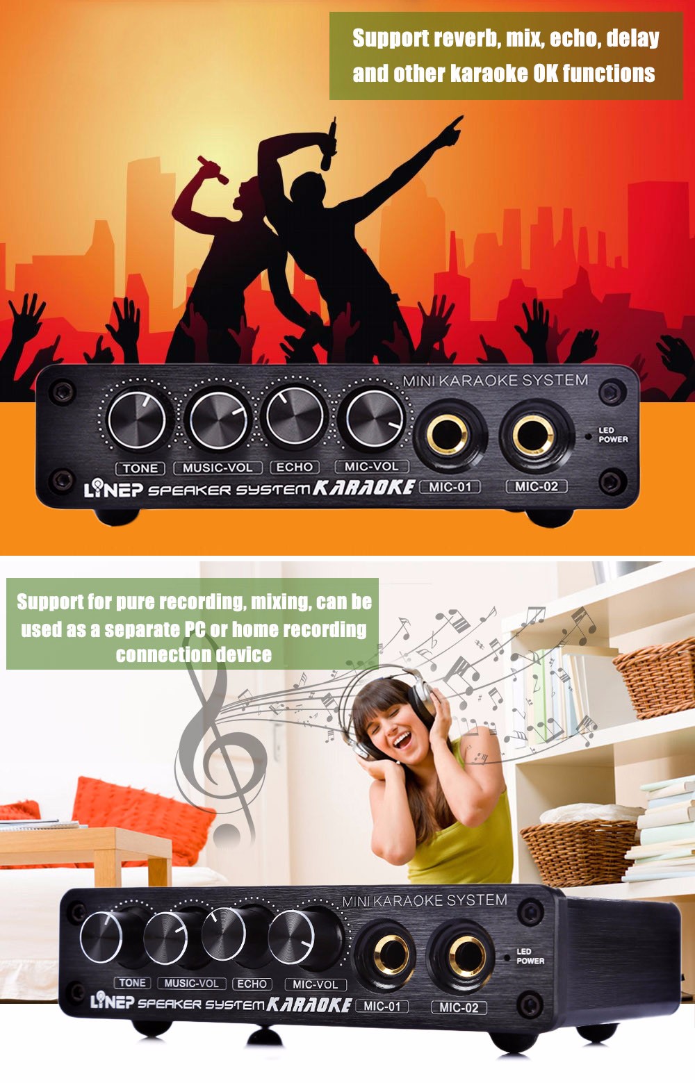 The second powerful function: Pure KTV effects: The product not only has the reverb effect, but also has the real damping tone, so your singing tone at home is perfect like that in KTV.