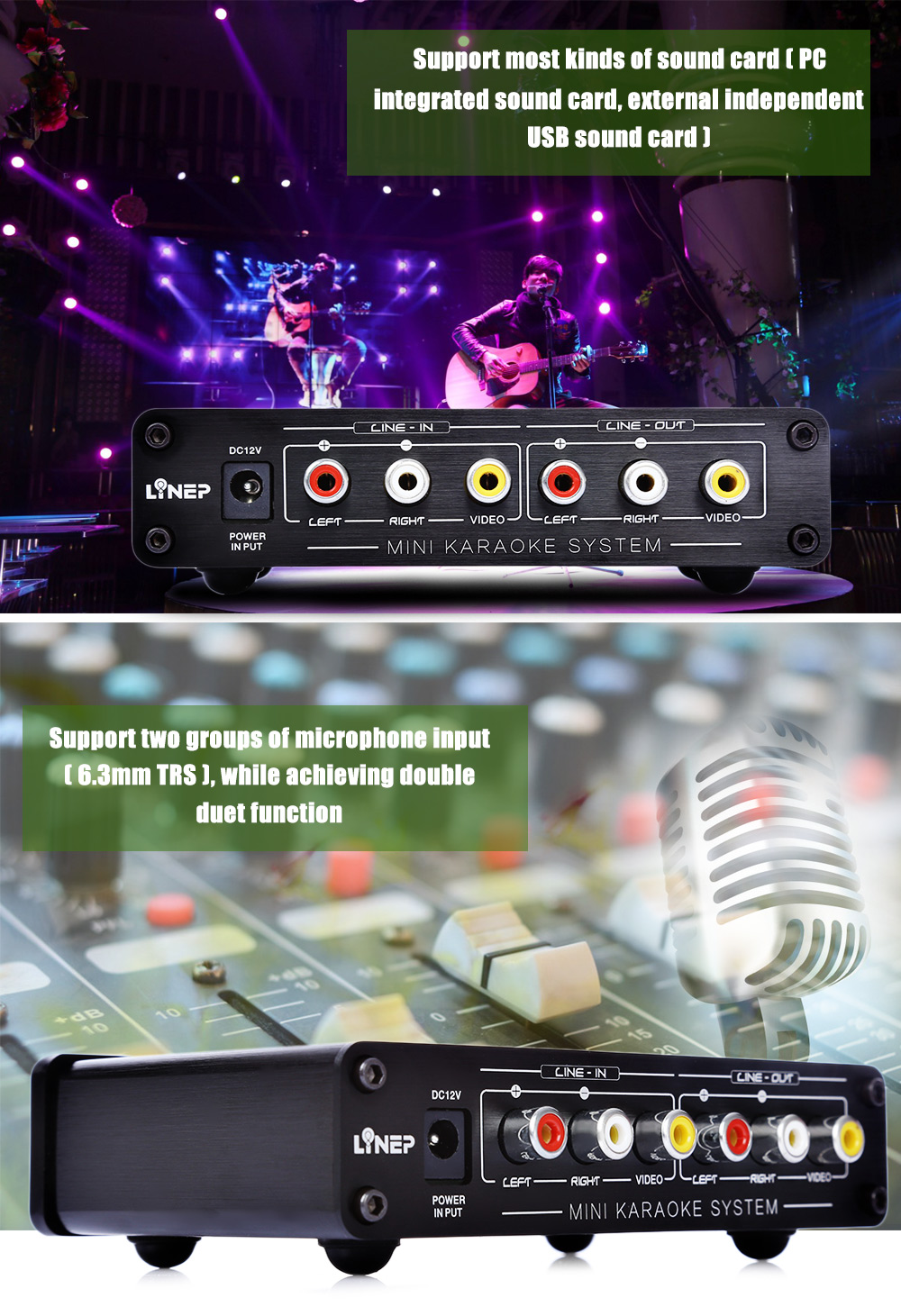 Support two sets of microphone input (6.3mm TRS), enable the simultaneous double singing function