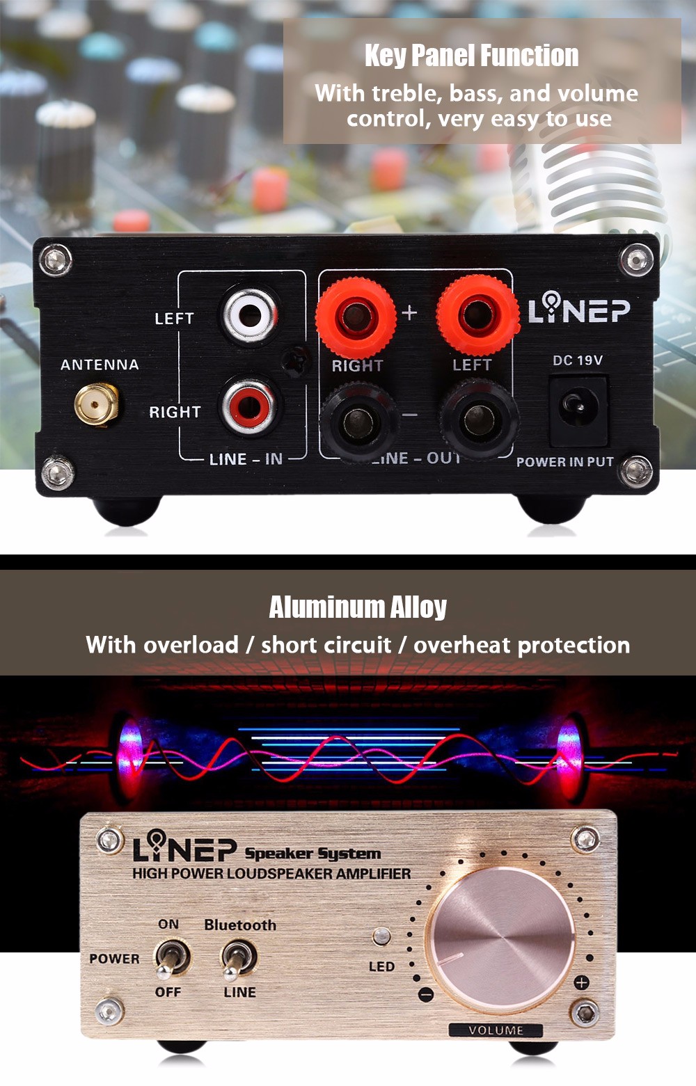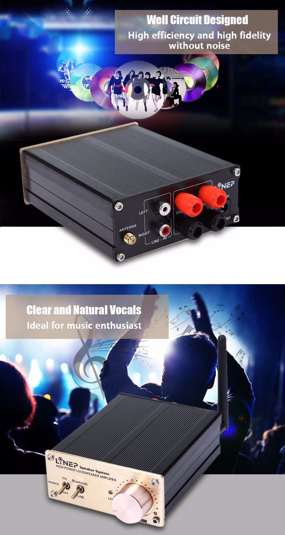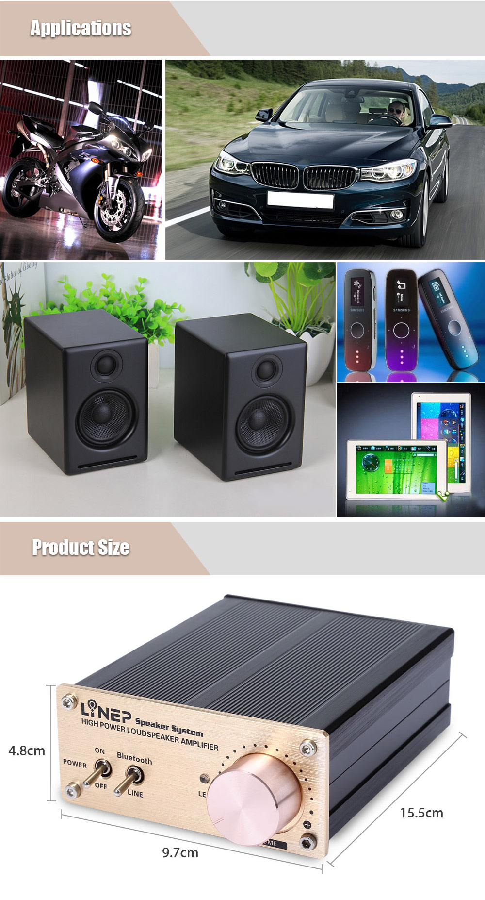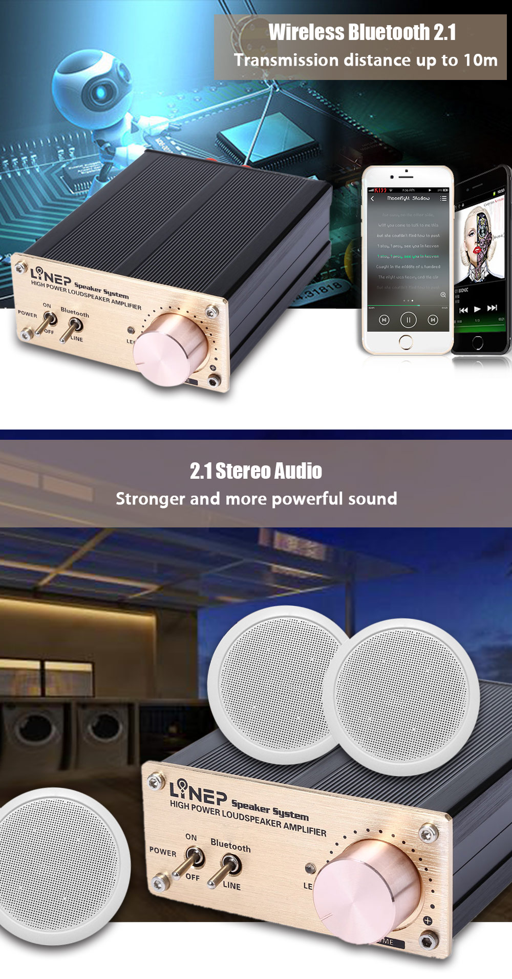 Bluetooth wireless and wired audio line double input mode, the convenience of different audio access.5 / Bluetooth receiver is perfectly compatible with Windows, Android, apple cell phone system and the computer terminal, one access, the boat can be identified, you can A variety of mobile audio playback of high quality music.6 / with mobility worldwide standard 110-240V power supply, full power small heat unperturbed, imported into the chip, the output power up to 100W, at the fingertips of music, listening, playing, Watch the machine in hand, manipulation of worry-free, high quality HIFI music, hi fi sound reduction, listen to music, play games, the film HIFI,