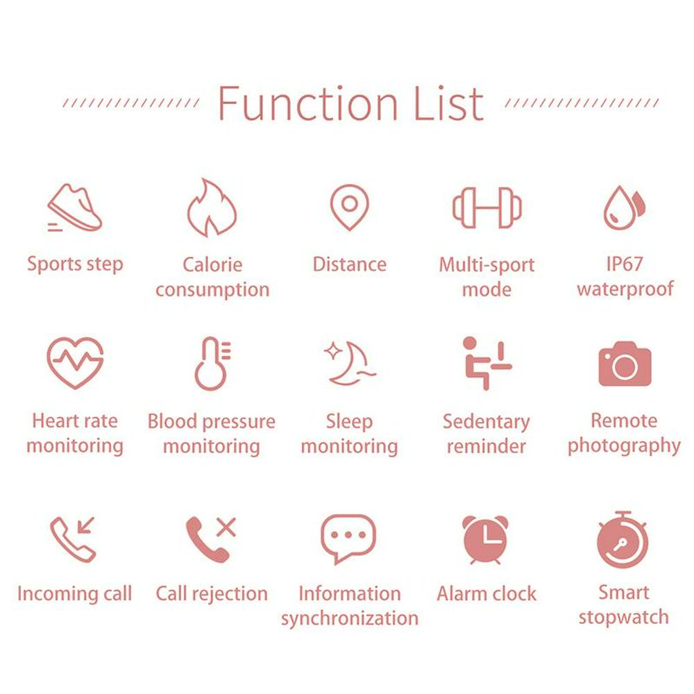 ● Blood Pressure Monitor, Heart Rate Monitor, Sleep Mode, Time, Remote Camera,Pedometer, vibrating reminder, Music Control, Alarm Clock, Stopwatch