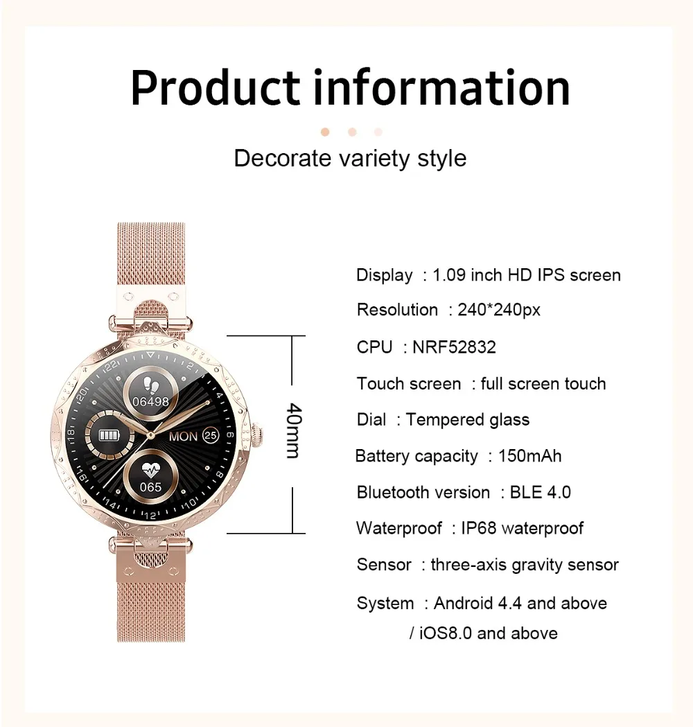 Girl Gift fashion watches IP68 waterproof watch 1.09 HD IPS full touch screen heart rate female health tracker PK H2 smart watch