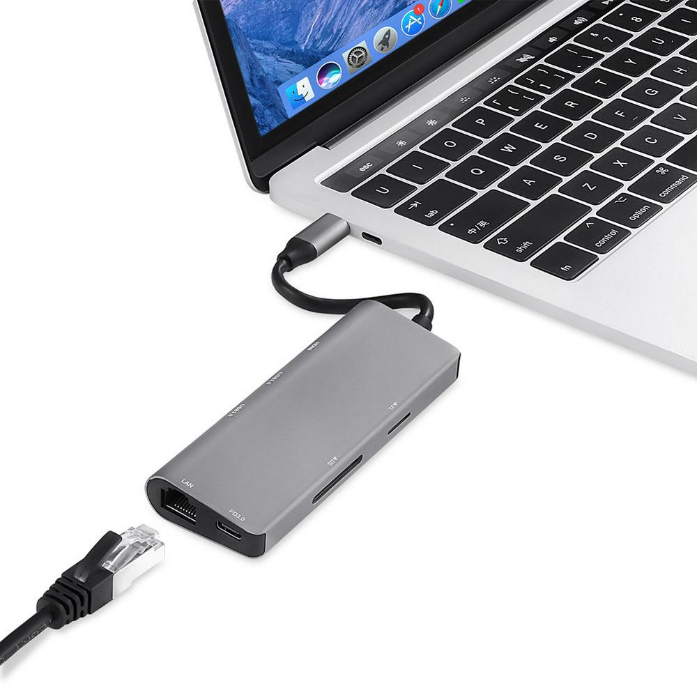 The USB Type-C charging port provides up to 60W of power for charging a laptop, and its HDMI output supports 4k high-definition displays.Via RJ-45 Gigabit Ethernet port ensures reliable internet connection. USB 3.0 port and card reader for efficient use.