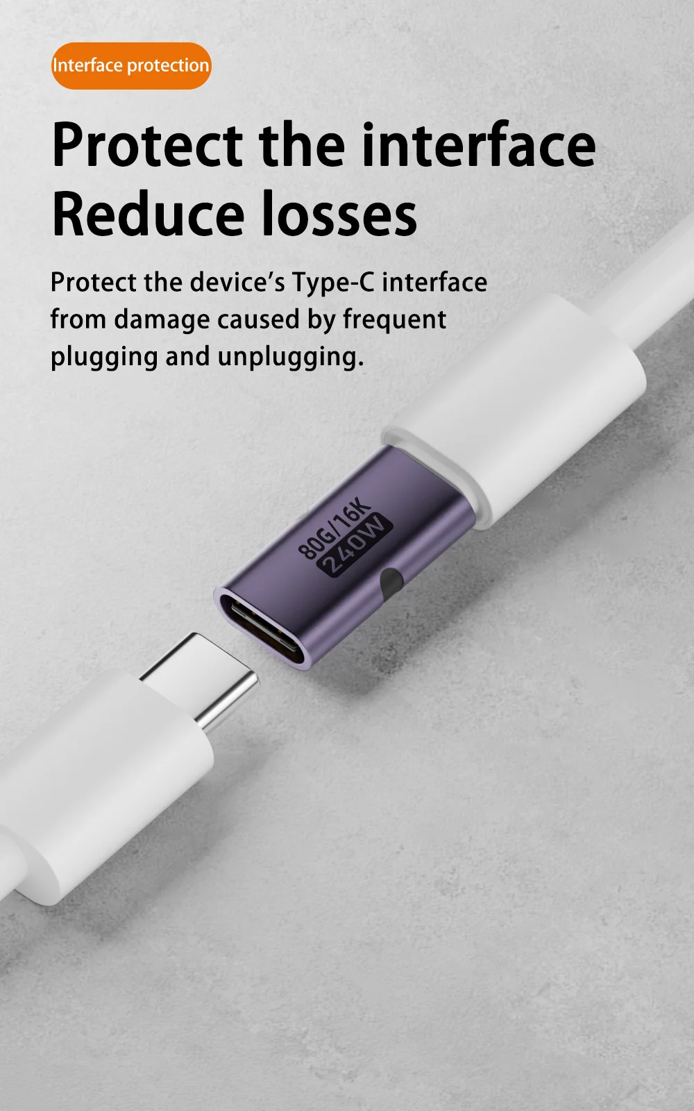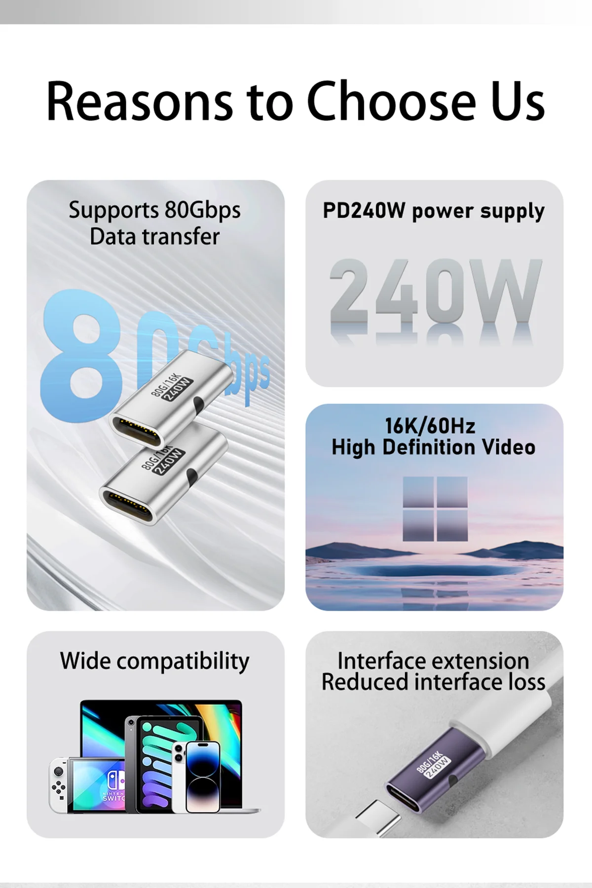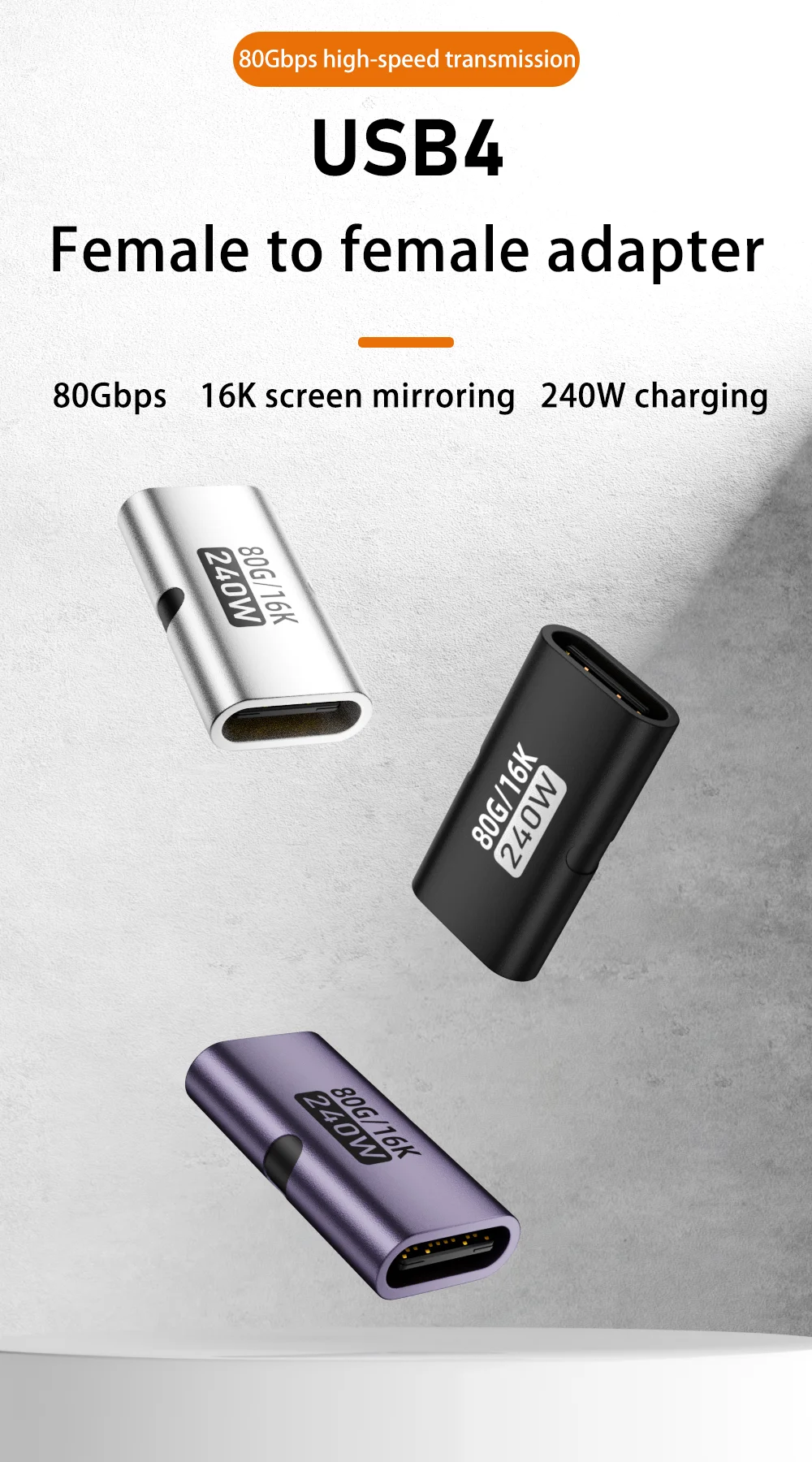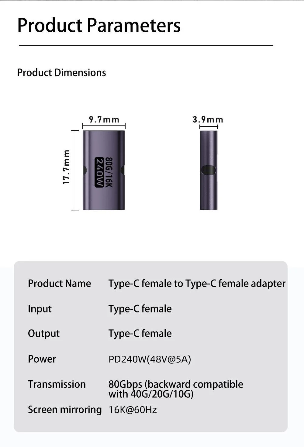 Aluminum Alloy Shell 16K Audio 80Gbps Quick Transfer Converter 240w Type C Female to Type-c Female Adapter for Phone Laptop TV
