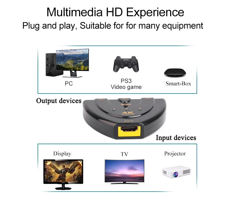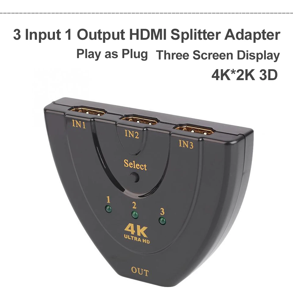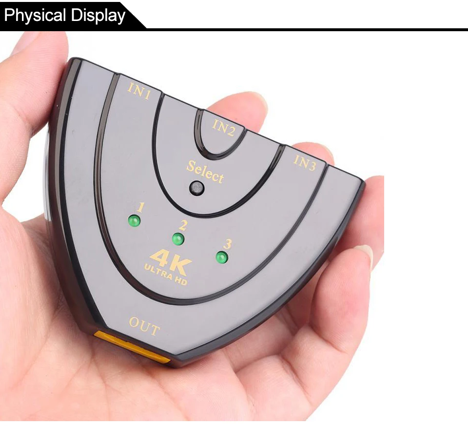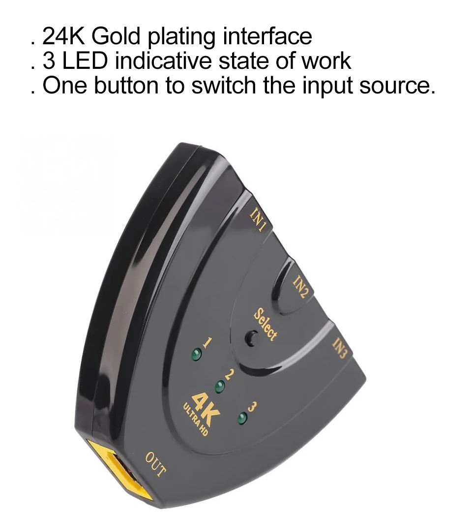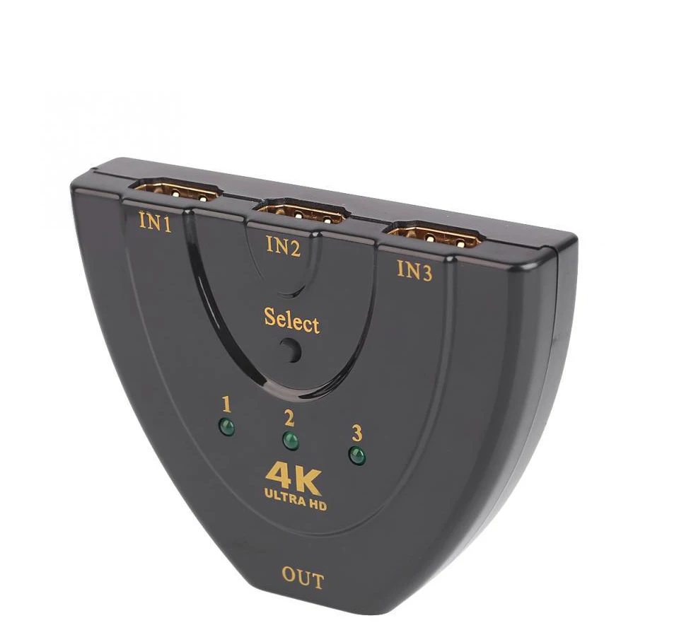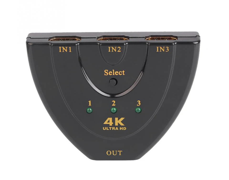 This HDMI switch with 3 inputs to 1 output has a button that has a switching function.