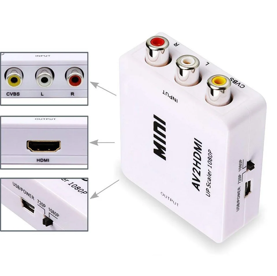 The MINI AV2HDMI converter is a universal converter for analog composite input to HDMI 1080p (60Hz) output.