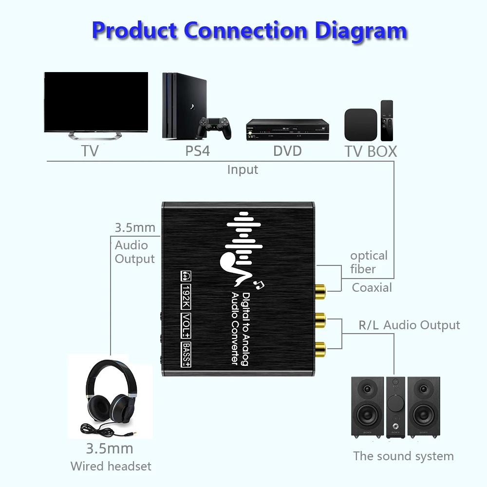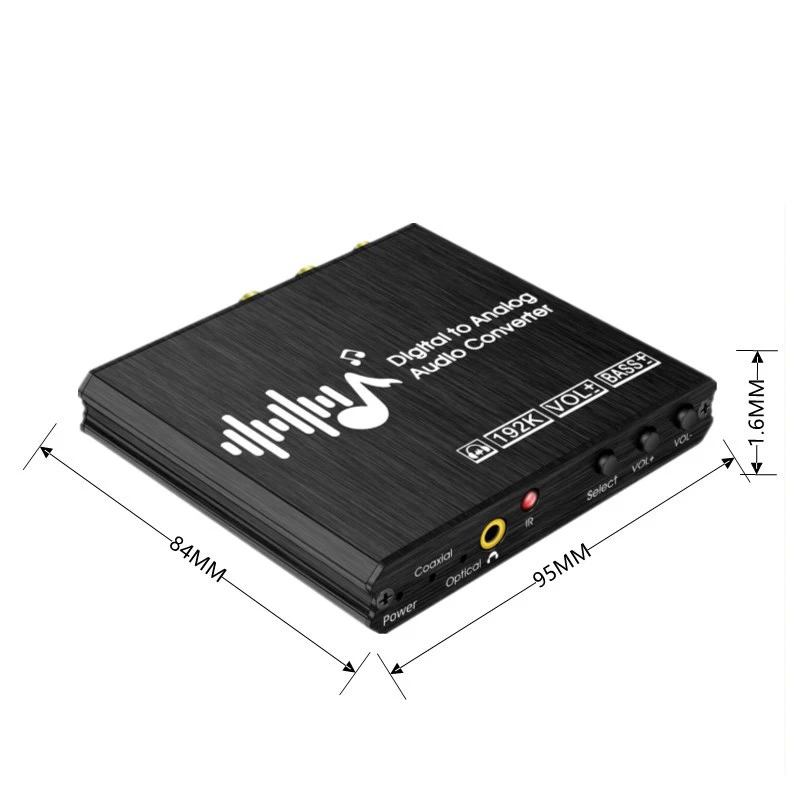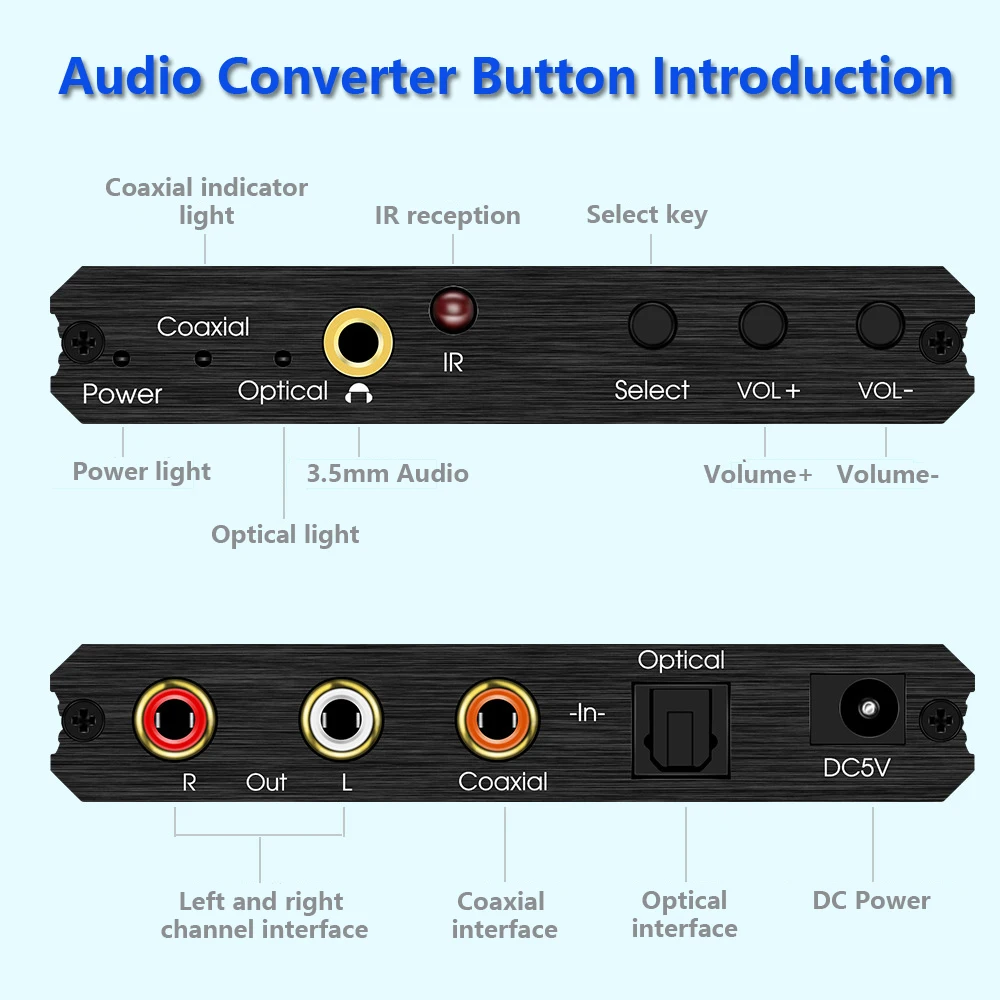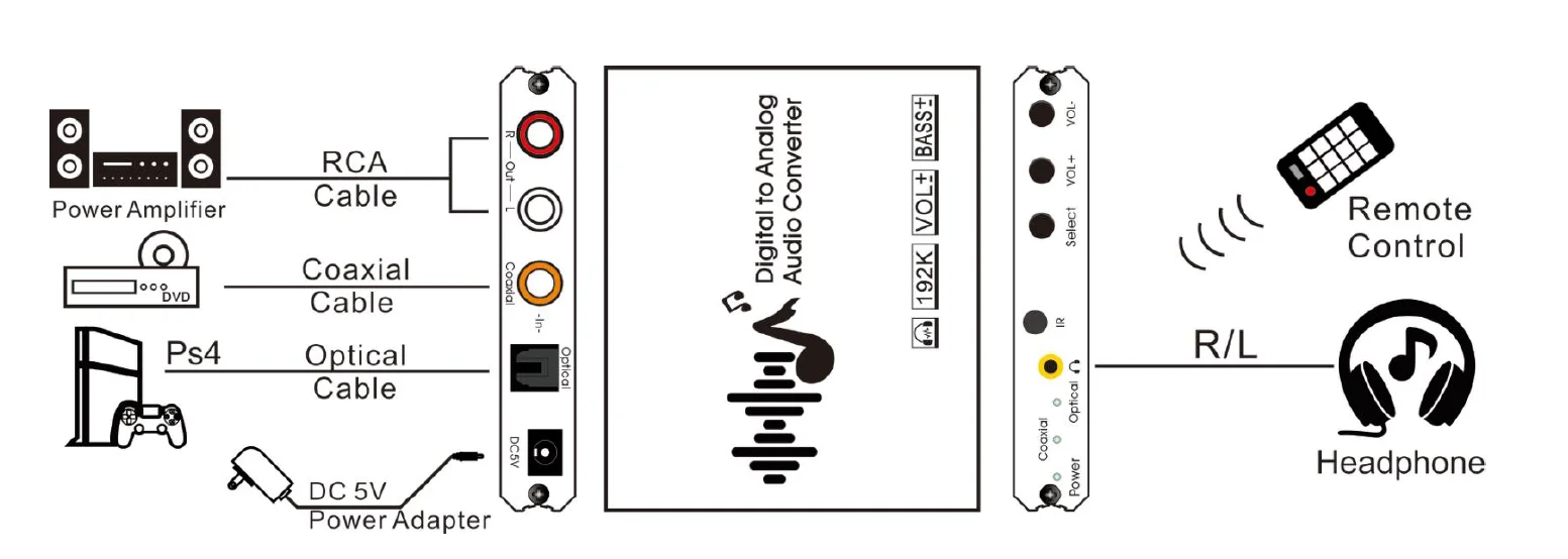 1. Connect CD/DVD and other playback devices to the optical or coaxial interface of the DAC with optical cable or coaxial cable. 2. Connect the decoder to the audio amplifier or headphones with RCA cable or 3.5mm audio cable. 3. Connect the 5V power adapter to the power port 4. Use the remote control or the buttons on the panel to adjust the volume. 5. According to your preference, adjust the bass component appropriately through the remote control.