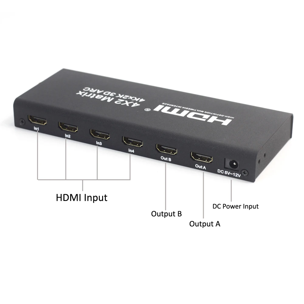 Supports switching or assignment of 4 HDMI inputs to 2 HDMI outputs