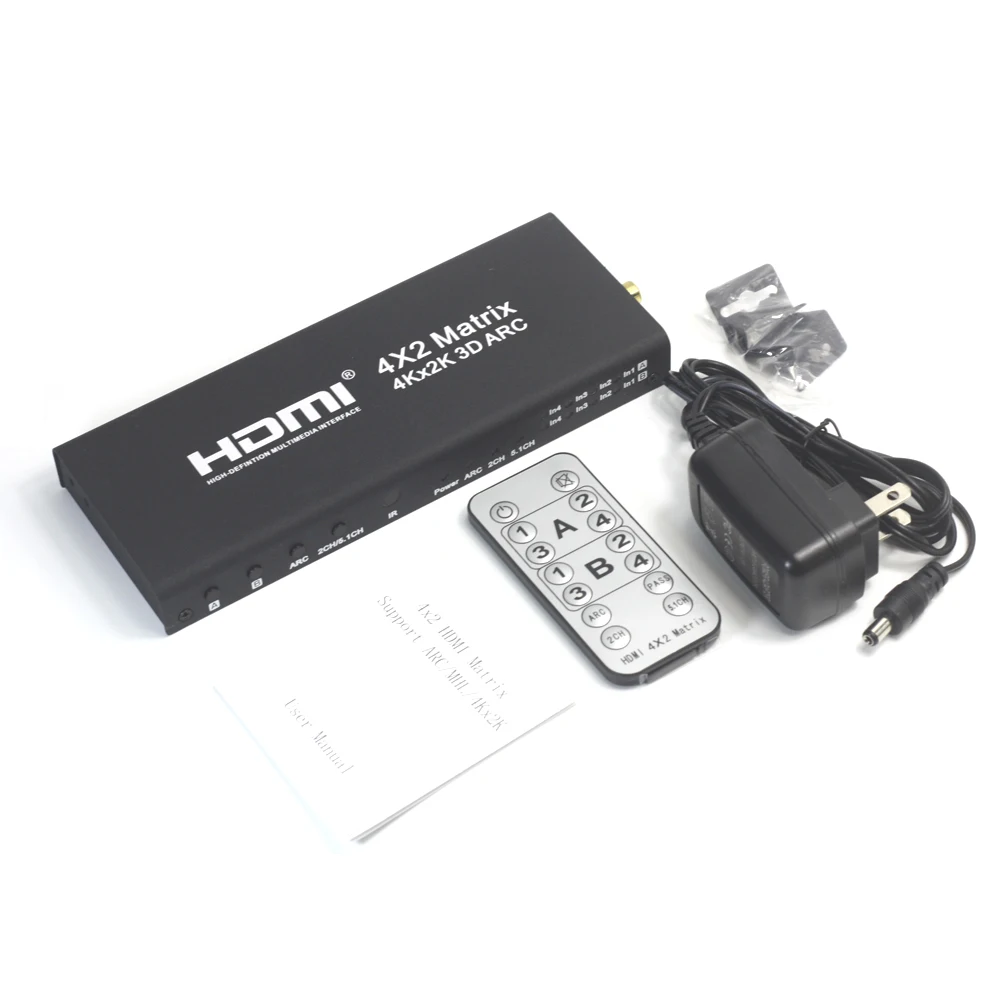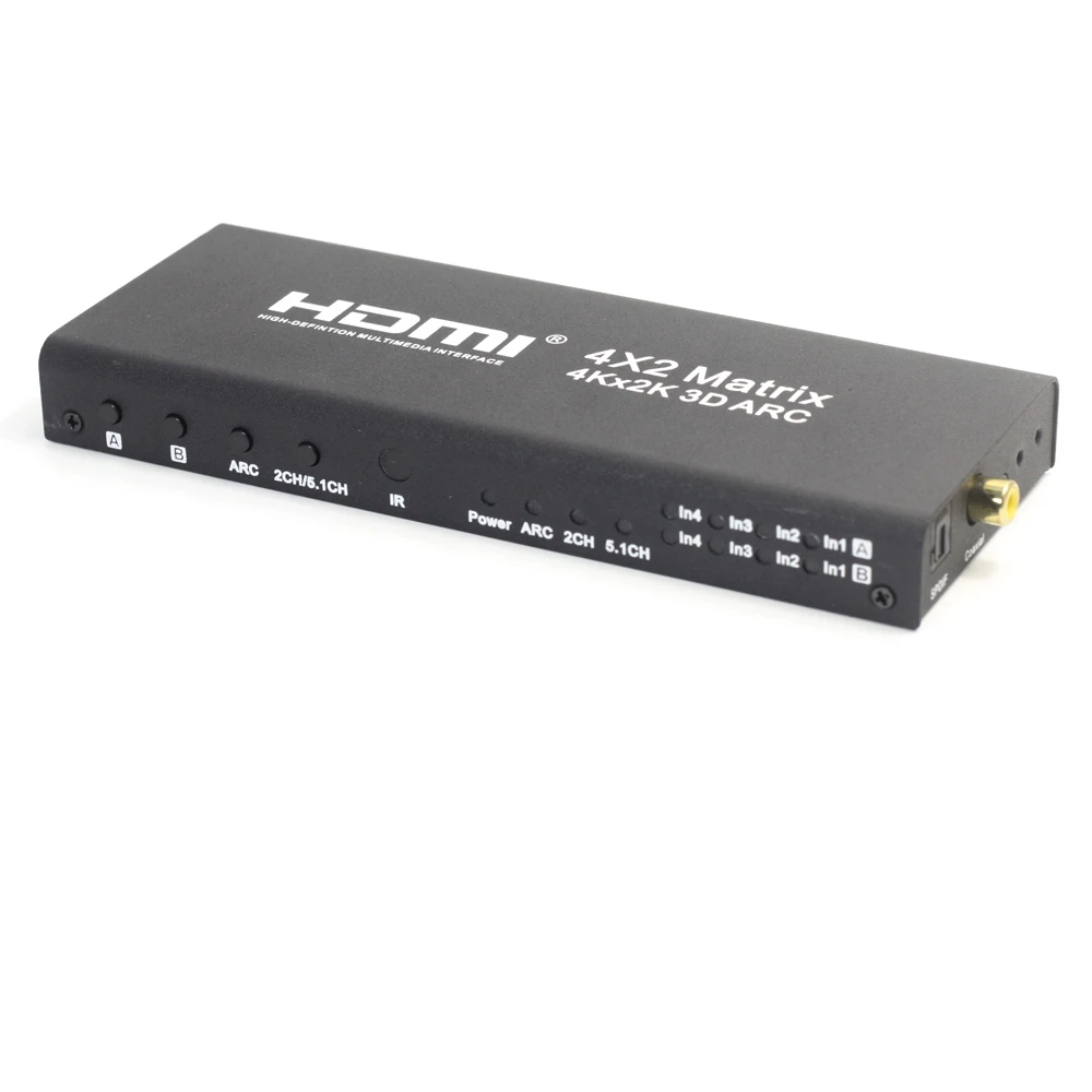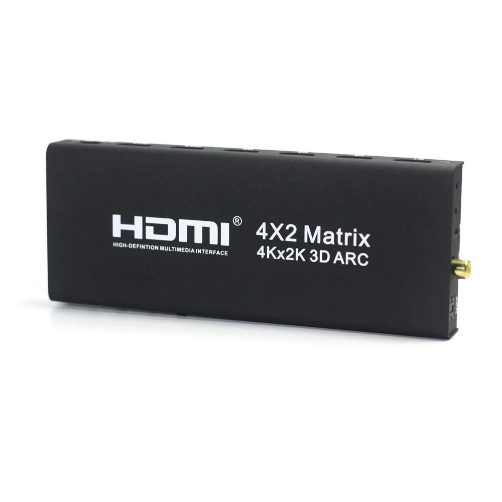 This HDMI 4X2 matrix can change the source of four-way high-definition input signal into two HDMI output you can change the output interface of two different images, you can also display the same image, and can support fiber, coaxial, headphone output stereo (the Audio output only supports Output A). It can easily be four high-definition signals on two compatible high-definition signal or projector screens free to change or distribution.