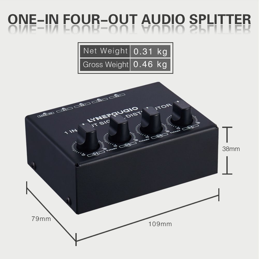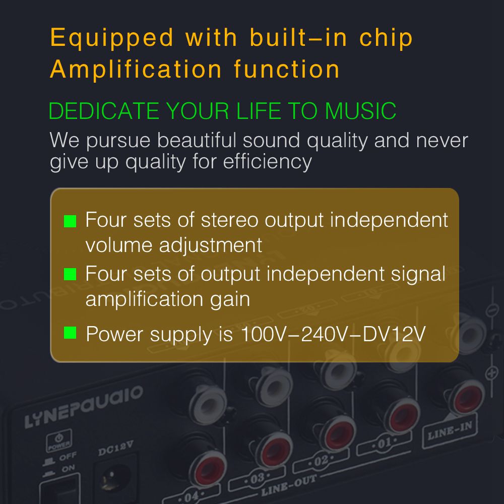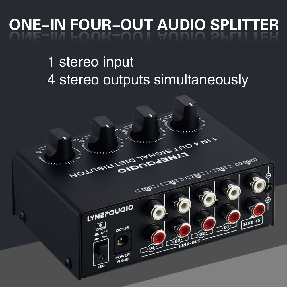If you have a line level signal source (TV audio, MP3 player, video game machine, cell phone, tablet, computer, record player, etc.) to output to other devices at the same time (such as power amplifier and speakers or headphones), this product can solve the problem of one set of stereo input, which can allocate four sets of stereo, output independent four sets of volume adjustment function, with each channel output band + 20dB gain.