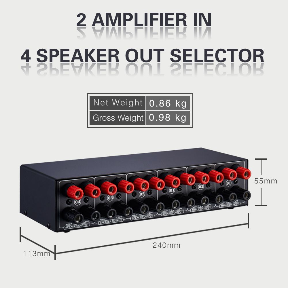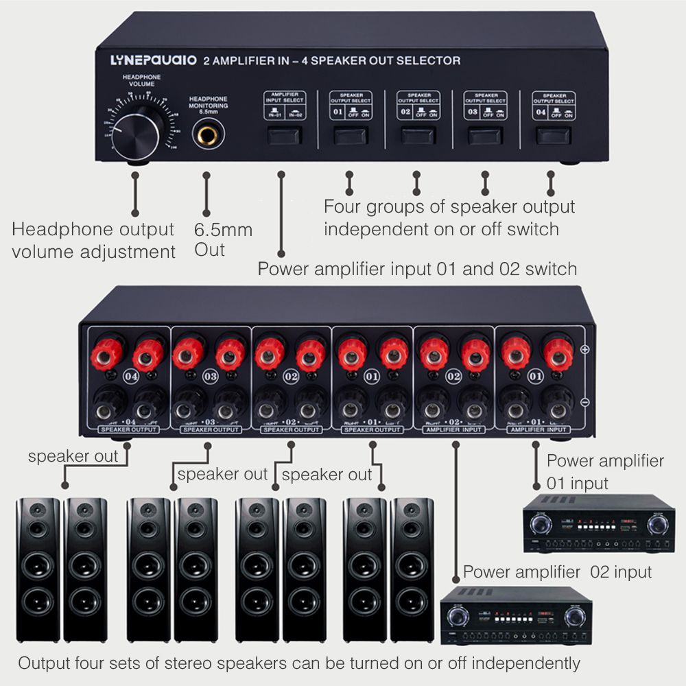 1 X 2 in and 4 out power amplifier and sound switcher, speaker, switch distributor, comparator, headset, monitoring function, audio input, 300W per channel, sound quality without loss