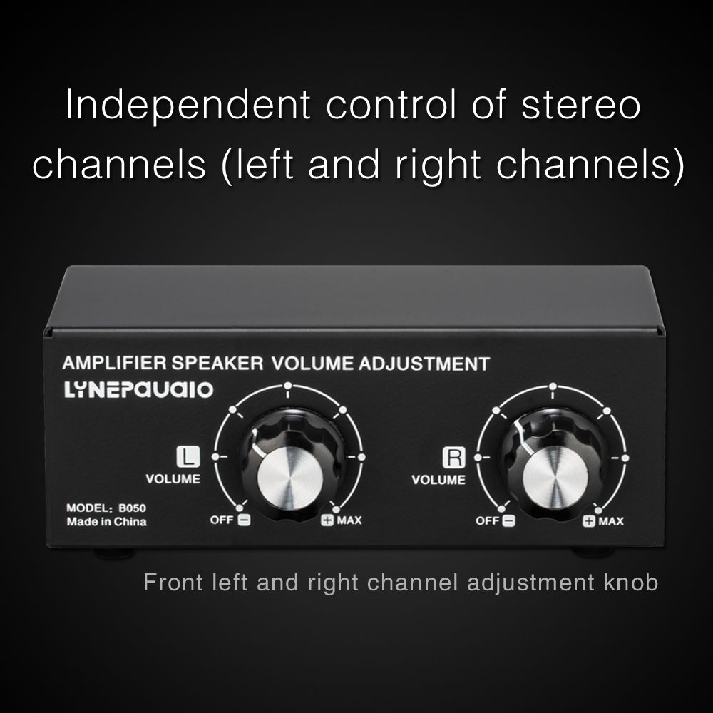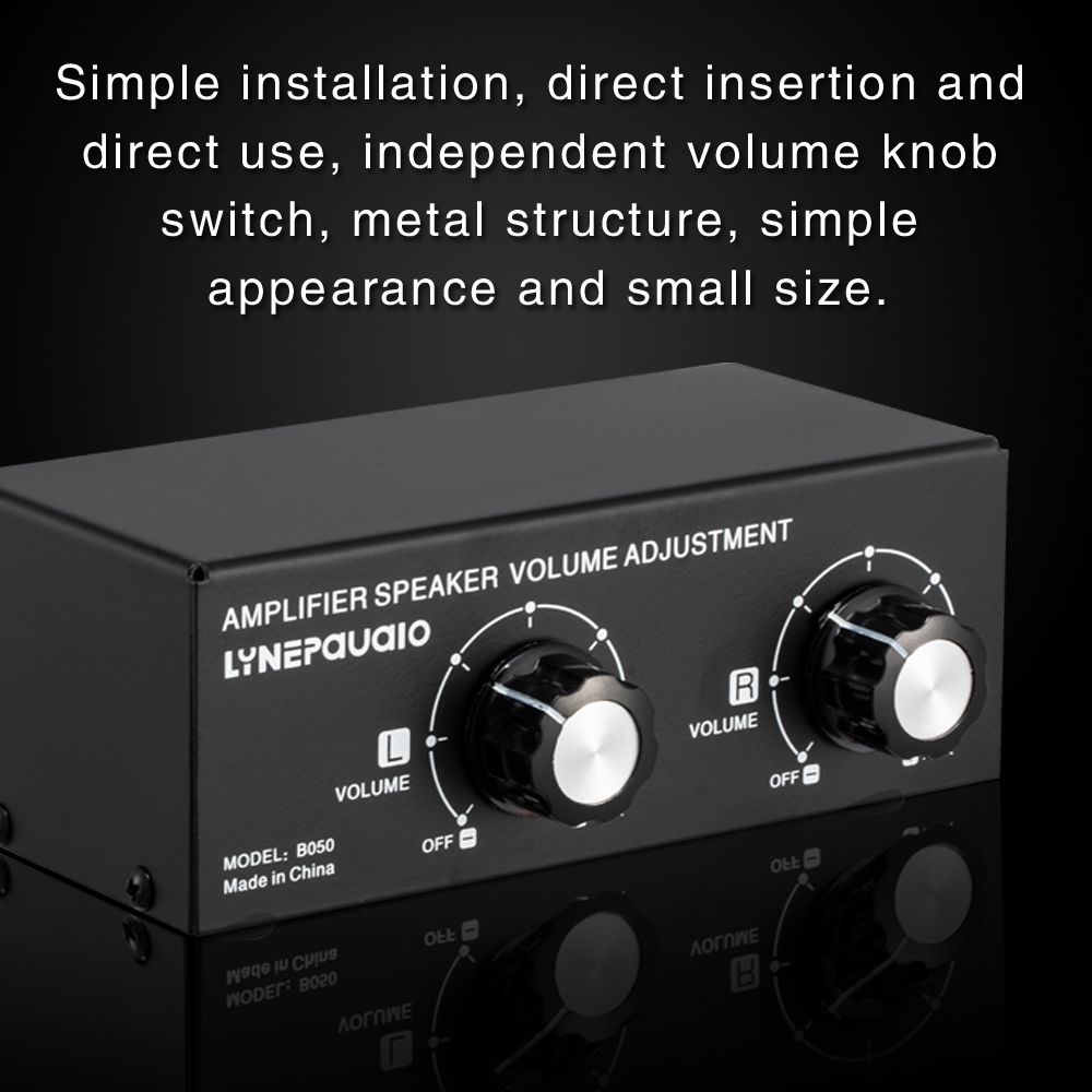 Desktop type power amplifier output passive speaker volume control box, it can easily control the volume of the sound channel of the passive sound box, easy for installation, just plug it in and use it. There is a separate volume knob switch, Metal construction, brief outward and Compact Size.