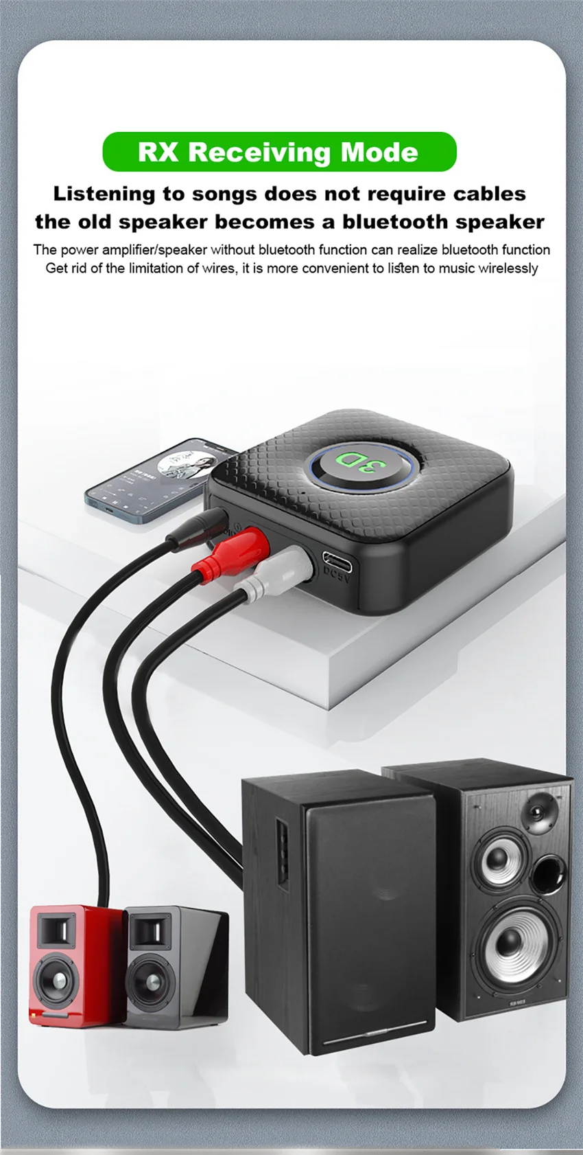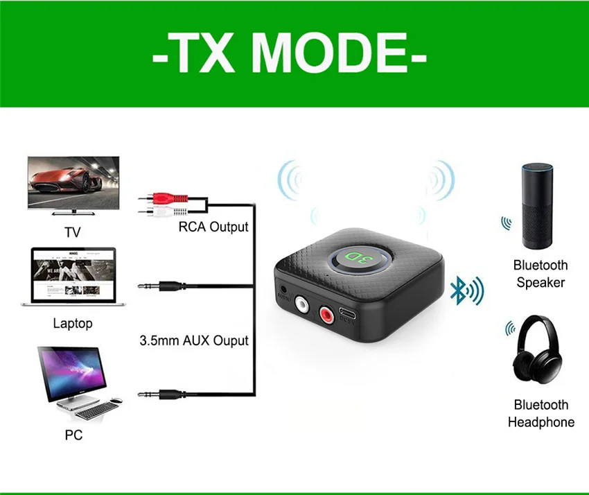 1. 2 In 1 TRANSMITTER RECEIVER MODE: 2in1 design, by using this wireless adapter, you can send and receive all of the audio freely and easily. Transmitter enables your TV, AV Receiver, Radio and other home audio source devices to stream music to your Bluetooth headphones or speakers; Receiver lets non-Bluetooth devices like your home stereo or AV Receiver and wirelessly stream music from your cellphone/PC.